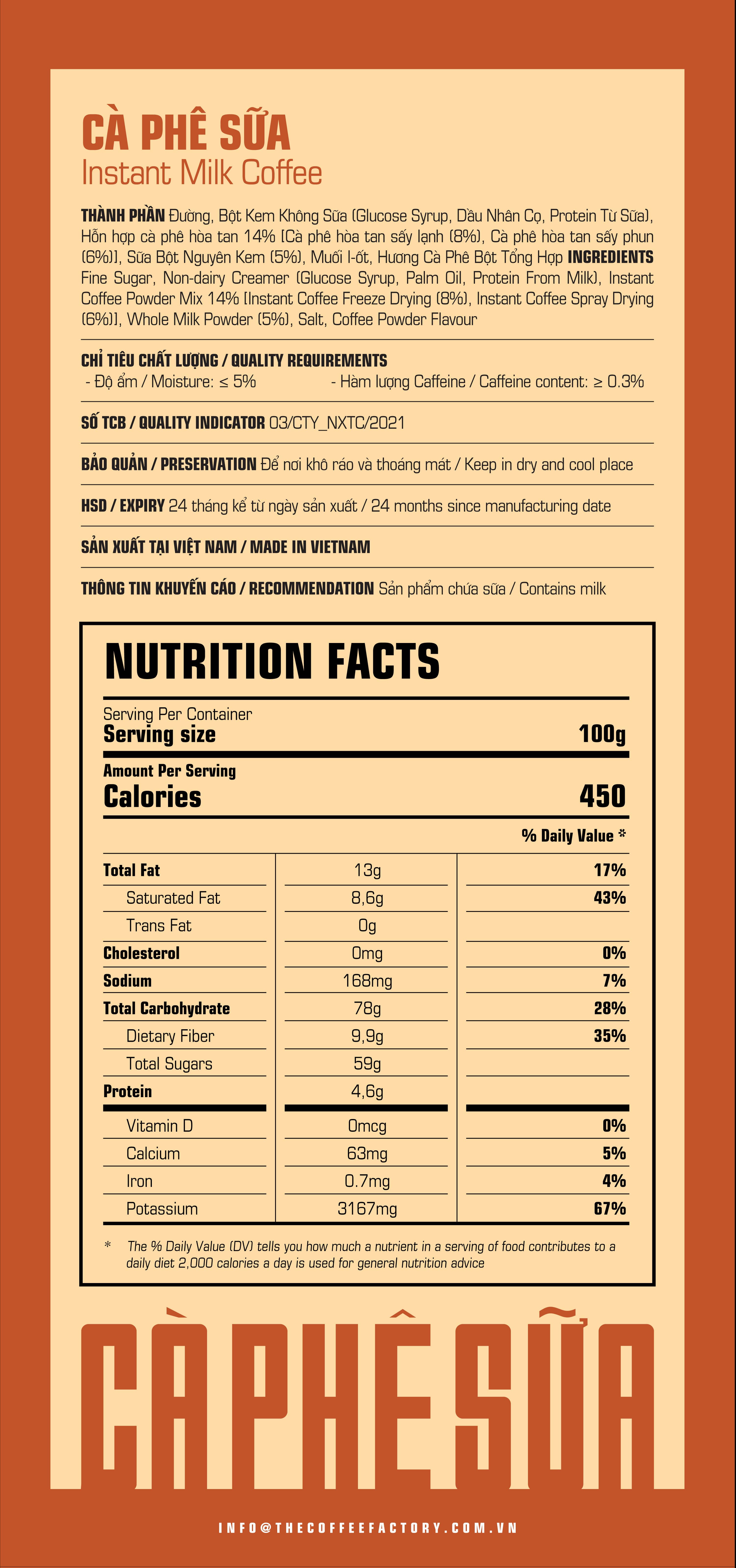 Thành phần: Cà phê hoà tan tinh chất, đường mantozơ (đường mạch nha), đường tinh luyện, hương tổng hợp, muối ăn. Instant coffee (35%), maltoza sugar, white sugar , food flaving, cooking salt. Chỉ tiêu