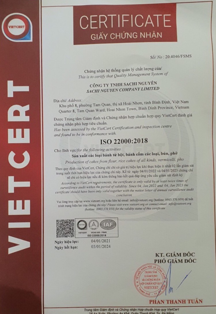 Bánh tráng gạo mỏng Sachi là món ăn không thể thiếu của người dân Bình Định, trong các dịp lễ cũng như các bửa ăn ngày thường. Thành phần: Gạo 93%, tinh bột mì, muối.