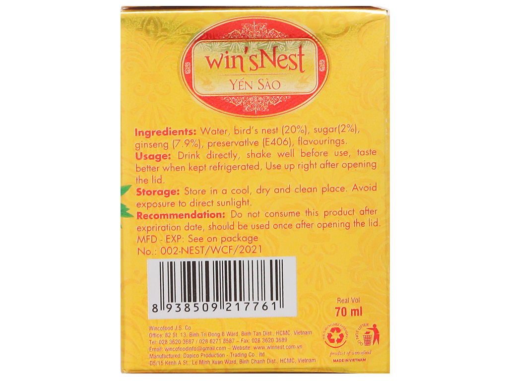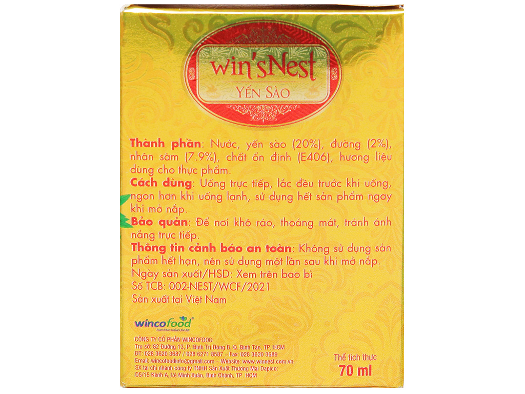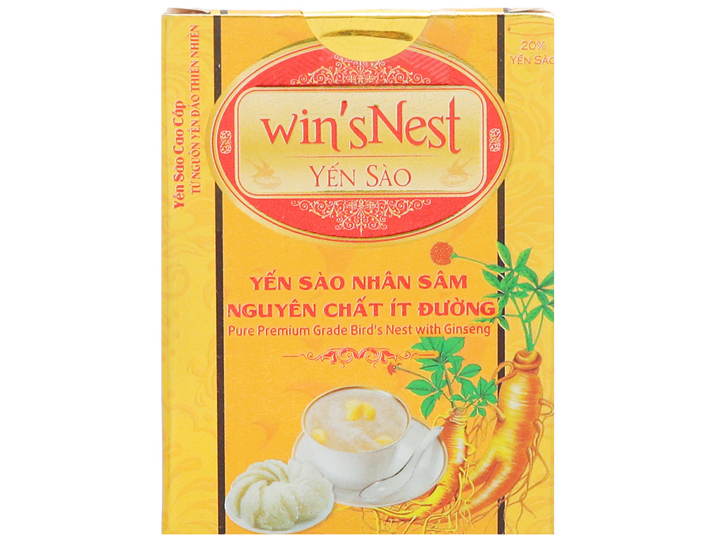 Yến sào cao cấp win'sNest tổ yến chưng sẵn nhân sâm ít đường được sản xuất từ nguồn yến đảo thiên nhiên, là một sản phẩm của công ty wincofood. Được sản xuất bằng phương pháp cổ truyền trên dây chuyền đạt tiểu chuẩn an toàn thực phẩm.