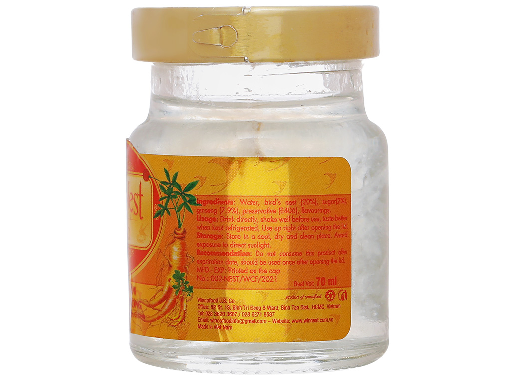 Thành phần: Nước, yến sào (20%), đường (2%), nhân sâm (7.9%) chất ổn định (E406), hương liệu dùng cho thực phẩm.