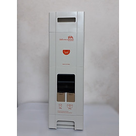 Thùng đựng gạo có 2 nút ấn lấy gạo: nút thứ nhất 150g, nút thứ hai 300g. Bạn chỉ cần ấn nút, gạo sẽ chảy xuống khay chứa đúng trọng lượng. Bạn có thể tự ước lượng số gạo cần lấy một cách chuẩn xác nhất.
