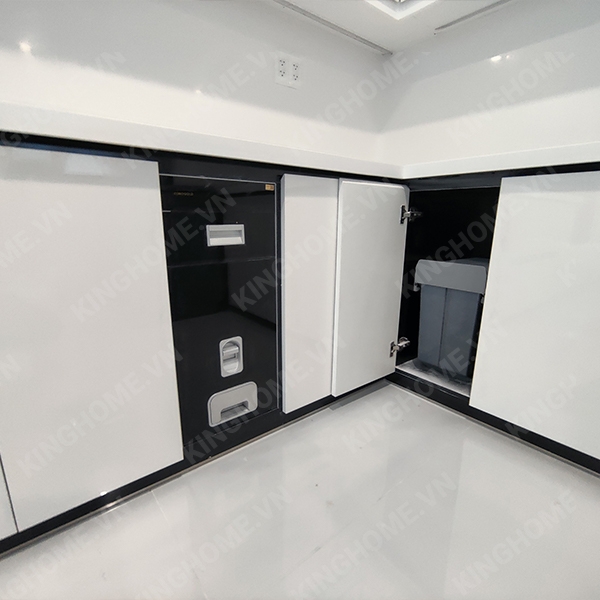 - Kiểu dáng sang trọng, ray hộp đẳng cấp giúp căn bếp thêm hiện đại. - Chỉ cần kéo cánh tủ ra (vào) là thùng tự động ra (vào) theo để bạn cho rác vào