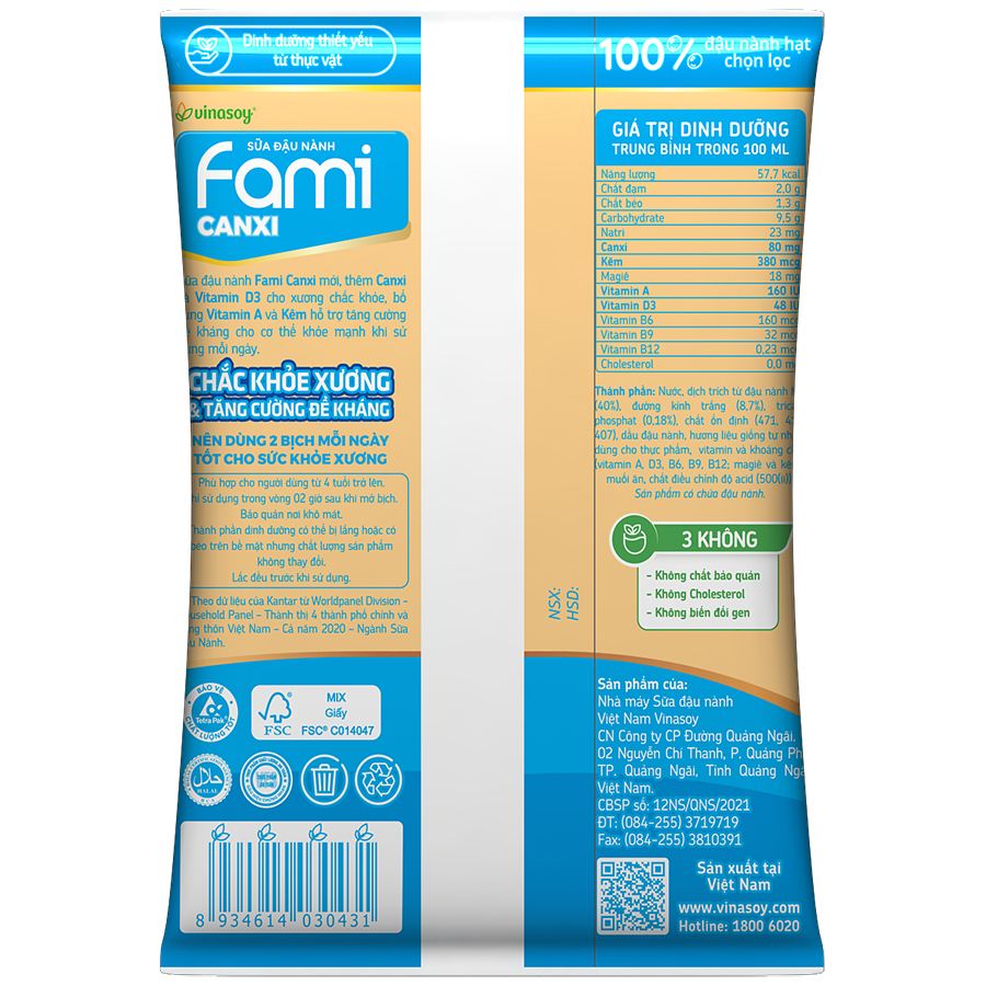 - Thùng Sữa đậu nành Fami Canxi (200ml x 40 Bịch) được làm từ 100% đậu nành hạt chọn lọc, không biến đổi Gen (Non - GMO).