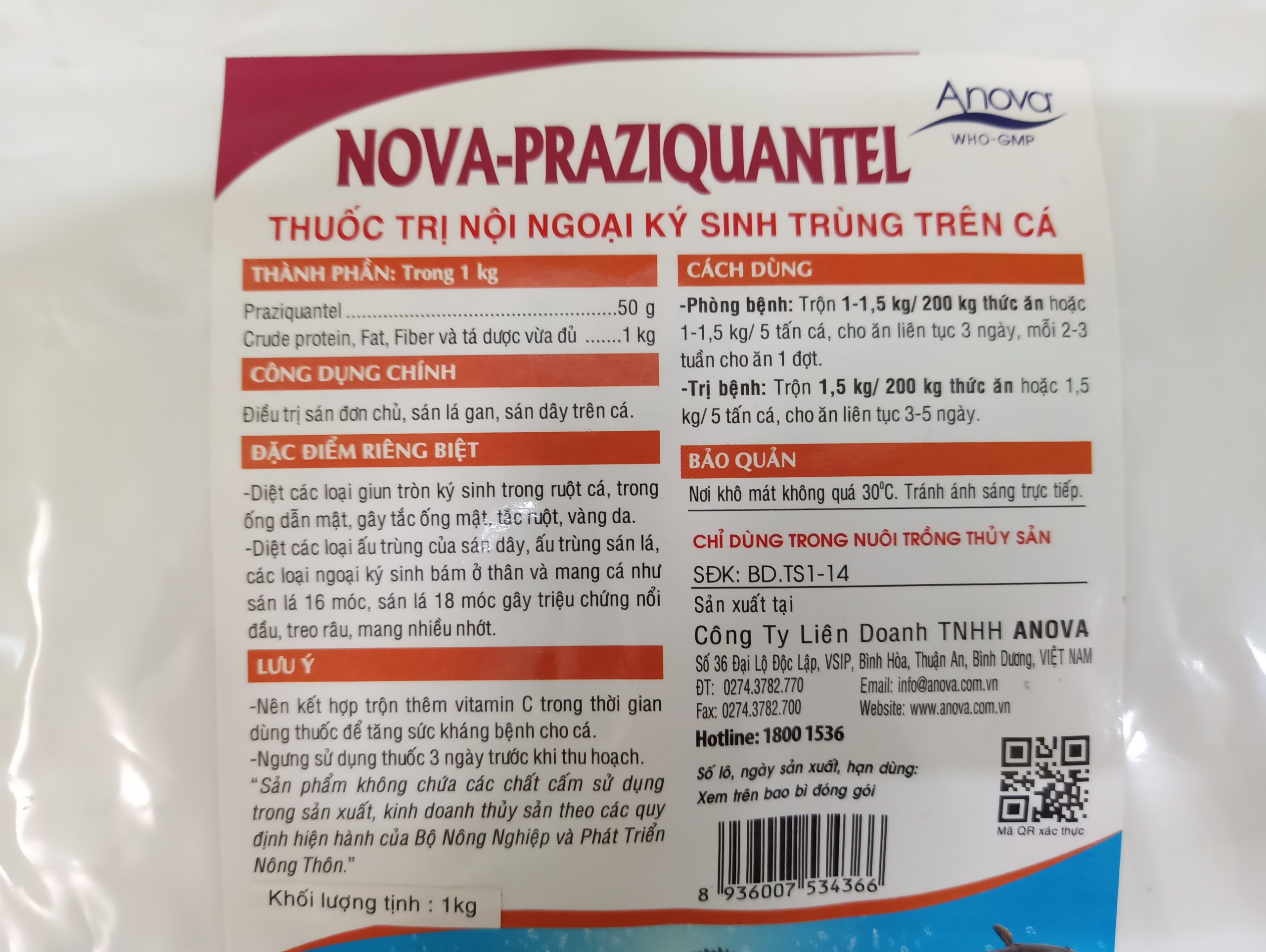 Thuốc Ngăn Ngừa Nội – Ngoại Ký Sinh Trùng Trên Cá Nova – Praziquantel Mã hàng: Nova – Praziquantel Hãng sản xuất: Anova – Việt Nam Quy cách: 1kg/gói THÀNH PHẦN: