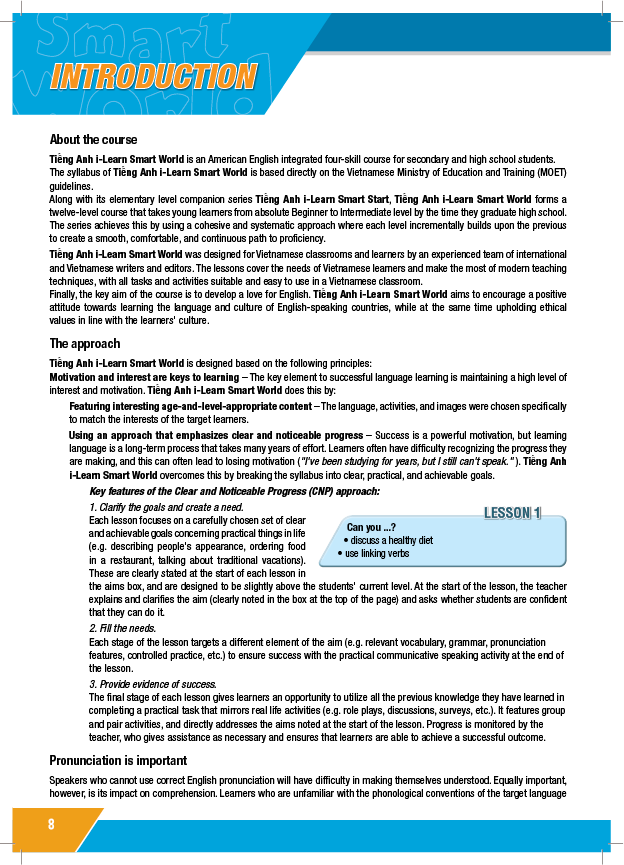 Tiếng Anh i-Learn Smart World là khóa học tiếng Anh dành cho học sinh THPT. i-Learn Smart World đã được phát triển bởi một đội ngũ giàu kinh nghiệm gồm các nhà văn, giáo viên quốc tế và Việt Nam để trở nên hoàn hảo cho lớp học Việt Nam và bao gồm đầy đủ chương trình giảng dạy quốc gia của Việt Nam và Khung Tham chiếu Ngôn ngữ Chung Châu Âu (CEFR). Tiếng Anh 10 i-Learn Smart World đã được Bộ Giáo dục và Đào tạo thẩm định và phê duyệt.