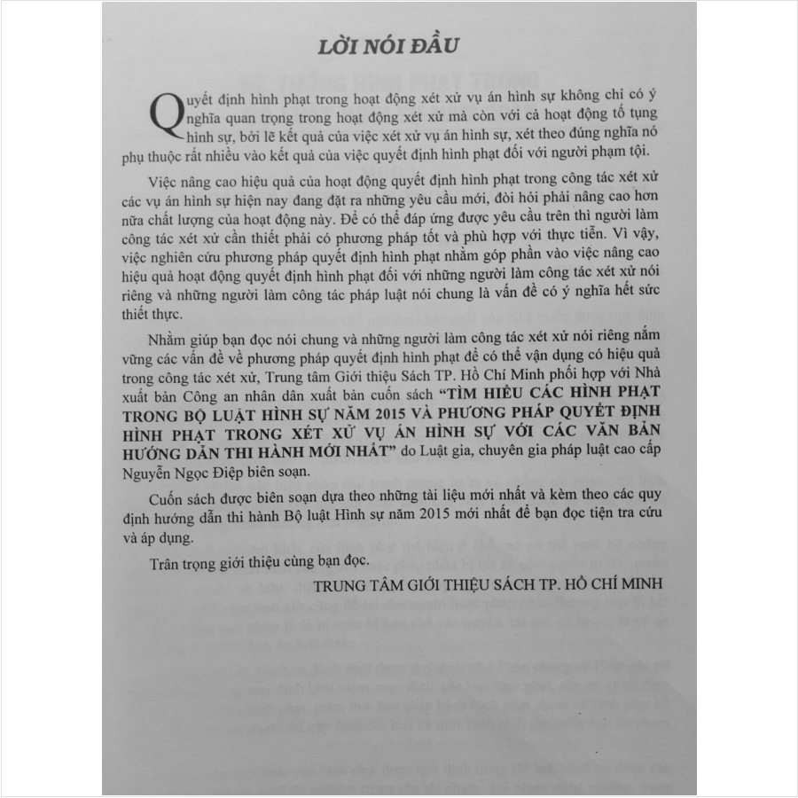 - PHẦN III: Các văn bản hướng dẫn thi hành bộ luật hình sự Cuốn sách được biên soạn dựa theo những tài liệu mới nhất và kèm theo các quy định hướng dẫn thi hành bộ luật hình sự năm 2015 mới nhất để bạn đọc tiện tra cứu và áp dụng. .../... Cảm ơn các bạn đã ghé thăm shop Nhà sách Nam Việt Sách Tìm Hiểu Các Hình Phạt Trong Bộ Luật Hình Sự Năm 2015 Và Phương Pháp Quyết Định Hình Phạt Trong Xét Xử Vụ Án Hình Sự - Luật gia Nguyễn Ngọc Điệp Sách Tìm Hiểu Các Hình Phạt Trong Bộ Luật Hình Sự Năm 2015 Và Phương Pháp Quyết Định Hình Phạt Trong Xét Xử Vụ Án Hình Sự - Luật gia Nguyễn Ngọc Điệp