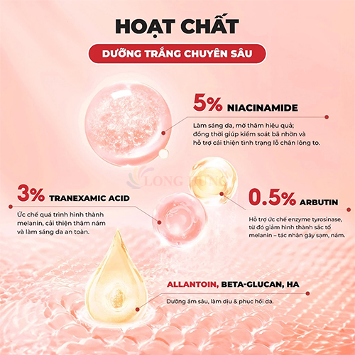 Công dụng: - Dưỡng da trắng sáng, căng mịn, đều màu - Cải thiện da tăng sắc tố, sạm và nám, hiệu quả từ 6 tuần - Mờ vết thâm do mụn, hiệu quả từ