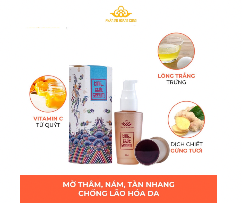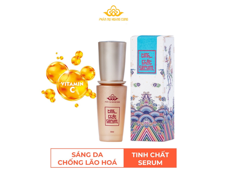 - Phấn Nụ Hoàng Cung là dòng sản phẩm mỹ phẩm truyền thống từ thiên nhiên của Việt Nam,nguồn gốc từ hoàng cung triều Nguyễn, Huế, (từ năm 1945) nguyên liệu bào chế hoàn toàn thiên nhiên, thích hợp dưỡng da và trang điểm hàng ngày, dùng được cho da nhạy cảm, mẹ bầu và mẹ sau sinh Serum được chiết xuất từ những nguyên liệu thuần Việt phù hợp với làn da phụ nữ châu Á. Tinh chất serum có kết cấu dạng nước với các vitamin dạng phân tử siêu nhỏ dễ dàng thẩm thấu, nuôi dưỡng cả 3 lớp biểu bì, thân bì và hạ bì. Trong tất cả các sản phẩm dưỡng da, thì serum là tinh chất quý giá và khá đắt đỏ. Chính vì vậy, dưỡng chất trong serum đậm đặc gấp 10 lần dưỡng chất trong các loại kem dưỡng thông thường. Trong khi các loại kem có kết cấu đặc và chỉ tác động đến lớp biểu bì và thân bì, thì serum với kết cấu lỏng và các phân tử siêu nhỏ linh hoạt tác động sâu vào lớp hạ bì, nuôi dưỡng tận gốc, phục hồi và tái tạo làn da tươi trẻ. Tinh chất serum của Phấn Nụ Hoàng Cung mang đến cho các chị em làn da sáng, mịn,mờ thâm sạm, tái tạo collagen giúp da săn chắc, chống lại các dấu hiệu lão hóa da, trẻ hóa làn da. Thành phần độc đáo gồm các nguyên liệu thuần việt của Tinh chất serum: