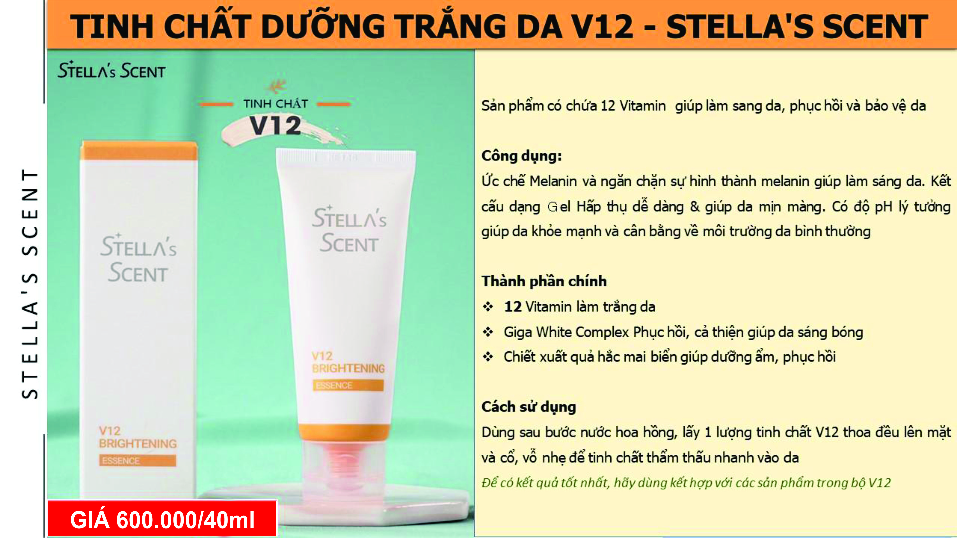 - Vỗ nhẹ để tinh chất thẩm thấu nhanh vào da Với quý chị em vẫn hay dùng hỗn tạp nhiều loại sản phẩm chăm sóc da, thì bạn nên chọn bộ dưỡng trắng da V12 Stella's Scent (bao gồm V12 Cream; V12 Essence; V12 Spot; V12 Cleansing Foam; 12 Toner) sẽ là giải pháp tối ưu nhất. Vì tất cả các sản phẩm được sản xuất bổ trợ, tương tác từ đó giúp cải thiện làn da hiệu quả nhất và không bị "xung đột kem", đó là lý do xác đáng nhất mà quý chị em nên cân nhắc khi chọn bộ dưỡng da cho mình.