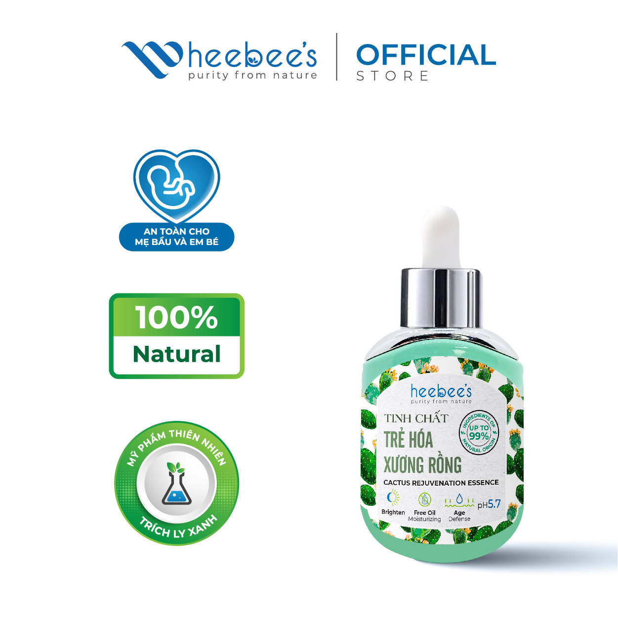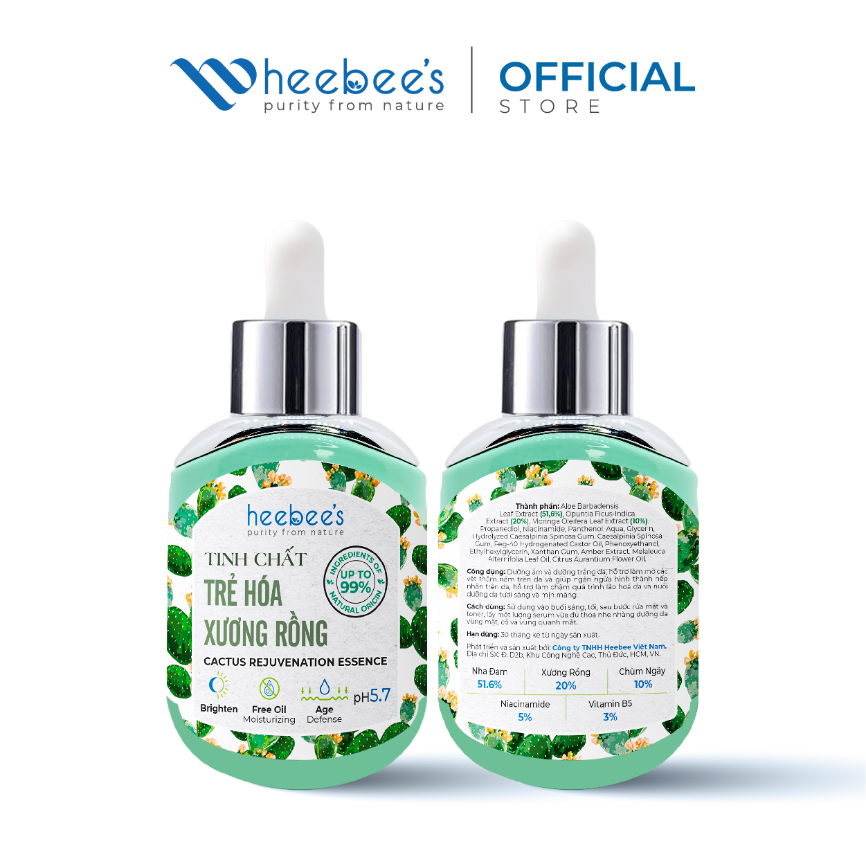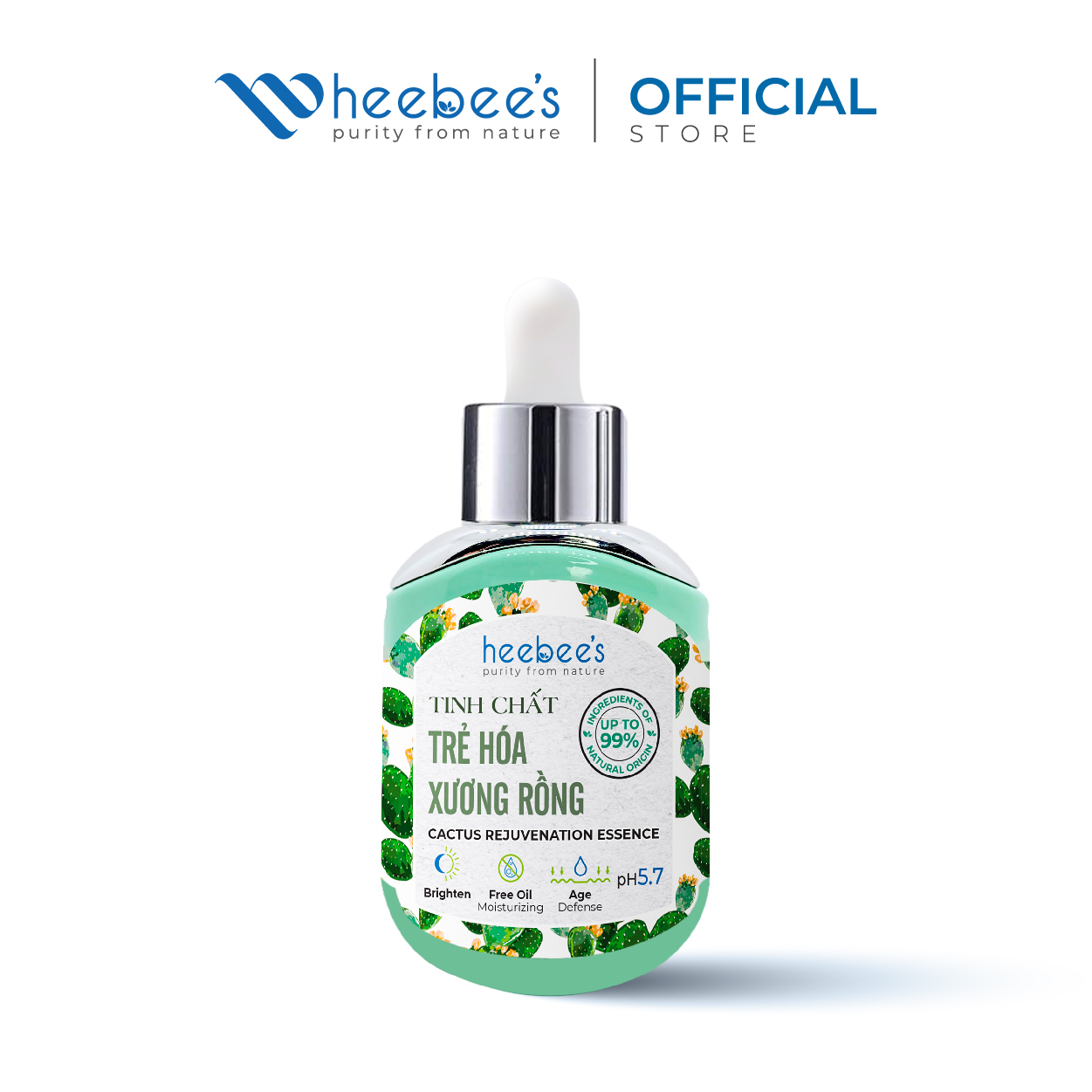 Tinh Chất Trẻ Hoá Xương Rồng Làm Trắng Da, Mịn Màng Và Căng Bóng Khai thác những tinh túy trong khả năng dưỡng ẩm và trẻ hóa da từ các loại thực vật nhiệt đới đặc trưng của Việt Nam, Tinh Chất Trẻ Hóa Xương Rồng Heebee với hàm lượng tự nhiên lên tới 99.9% là một sản phẩm giúp tái sinh làn da, sở hữu quyền năng 3in1 dưỡng trắng, dưỡng mịn căng bóng và đẩy lùi lão hóa. Công thức dưỡng Oil_free với hệ thống dưỡng thực vật tinh khiết không chứa dầu, màu xanh rêu tự nhiên từ thực vật, nhẹ êm như nước, và thẩm thấu nhanh mà không gây nặng bí hoặc nhờn rít da. CÔNG DỤNG CỦA TINH CHẤT TRẺ HOÁ XƯƠNG RỒNG Nét đột phá của sản phẩm Tinh Chất Trẻ Hoá Xương Rồng Heebee đến từ việc phát triển thành công Chiết xuất Xương Rồng với kỹ thuật siêu âm đến từ đội ngũ nghiên cứu Heebee. Xương rồng vốn là loài cây sở hữu nhiều hoạt chất chống oxy hóa và phục hồi, nhờ vào kỹ thuật trích ly công nghệ cao đã giúp thu hoạch trọn vẹn các hoạt chất thành phần chất lượng như piscidic acid, isorhamnetin... Những hoạt chất này có khả năng vượt trội trong việc thúc đẩy sự sản sinh collagen tự nhiên và cân bằng độ ẩm làn da, đồng thời tạo sự cân bằng hệ vi sinh duy trì độ ẩm thiết yếu cho làn da, đẩy nhanh quá trình làm lành các tổn thương, tăng khả năng tự bảo vệ của da trước các tác động xấu từ môi trường, sinh lý và tuổi tác, làm chậm quá trình oxy hóa da và ngăn ngừa dấu hiệu lão hóa và dưỡng da mịn màng, đều màu, trẻ trung. Hệ thống trẻ hóa của Tinh Chất nhờ vào các hoạt tính đắt giá được Heebee trực tiếp nghiên cứu và khai thác từ nguồn thực vật đặc trưng Việt Nam kết hợp cùng nguồn nguyên liệu đạt chứng nhận Hữu Cơ ECOCERT COSMO của Châu Âu, tạo nên hệ thống dưỡng da thực vật chất lượng cao giúp chống lại sự hình thành hắc tố melanin, đồng thời làm chậm quá trình oxy hóa dưới da, phục hồi và thúc đẩy tái tạo tế bào da mới một cách vượt trội và duy trì vẻ đẹp tự nhiên bền lâu. Sự kết hợp của chiết xuất Xương Rồng cùng chiết xuất từ lá Chùm Ngây tạo nên công thức đột phá chống lại các gốc tự do gây lão hóa, phục hồi làn da bị tổn thương, tăng cường hệ miễn dịch và sức sống của tế bào da trước sự xâm nhập của các gốc tự do từ môi trường hay sinh lý. Sự xuất hiện của Vitamin B5 Panthenol và chiết xuất từ cây Nha Đam giúp giúp xoa dịu các dấu hiệu kích ứng, xây dựng hàng rào bảo vệ lý tưởng cân bằng hệ vi sinh có lợi trên da và chủ động cung cấp dưỡng chất, kích thích tạo ra elastin và collagen tự nhiên cho vùng hạ bì, se mịn lỗ chân lông bằng cách lấp đầy các khoảng lồi lõm dưới da (nguyên nhân sinh ra nếp nhăn do tuổi tác). Kỹ thuật siêu âm chiết xuất lá Chùm Ngây giúp bảo toàn các flavonoid; đóng góp một lượng lớn hàm lượng vitamin C thực vật và kẽm tự nhiên dưới sự trợ dẫn tăng hoạt tính của Niacinamide, giúp tăng độ đàn hồi, tạo sự săn chắc và dưỡng trắng da một cách lành tính và hiệu quả bất ngờ. Làm sáng các vùng da xỉn màu, ngăn chặn và giảm sự hình thành các đốm nâu, nám và tàn nhang. Đồng thời giảm thiểu đáng kể tình trạng lỗ chân lông to, dư dầu nhờn hoặc bị khô ráp thiếu sức sống. Tinh Chất Trẻ Hóa Xương Rồng có kết cấu dạng gel, nhẹ, thấm nhanh mà không gây bết dính sau khi thoa, pH 5,7 ± 0.5: