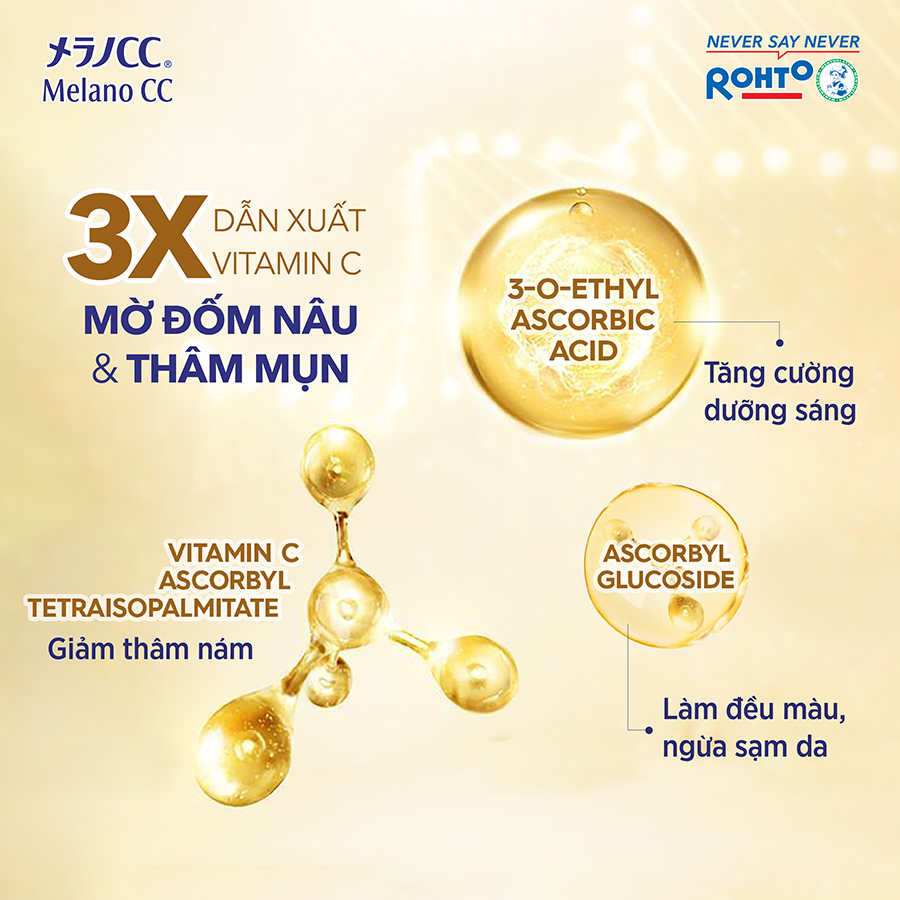 Thành phần chính và công dụng: Tinh chất vitamin C dưỡng trắng Melano CC với công dụng làm mờ thâm nám, làm sáng thâm mụn và dưỡng da sáng mịn đều màu