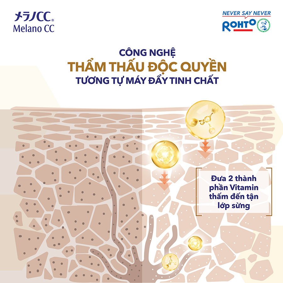 - Tinh chất vitamin C dưỡng trắng Melano CC được áp dụng công nghệ thẩm thấu độc quyền đưa Vitamin C và Vitamin B6 thấm sâu vào da tựa máy đẩy tinh chất (thấm sâu gấp 4.48 lần so với Melano CC Whitening Essence bản cũ) Hướng dẫn sử dụng: