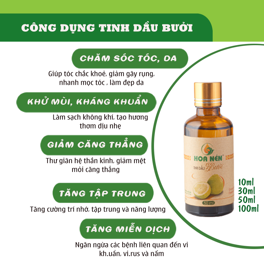 Tinh dầu bưởi được chiết xuất từ vỏ bưởi da xanh bằng phương pháp chiết xuất hơi nước. Thành phần gồm Limonen, A-pinen, Linalol, Geraniol, Citral; còn có các Alcol, Pectin, Acid citric. CÔNG DỤNG: CÁCH SỬ DỤNG: