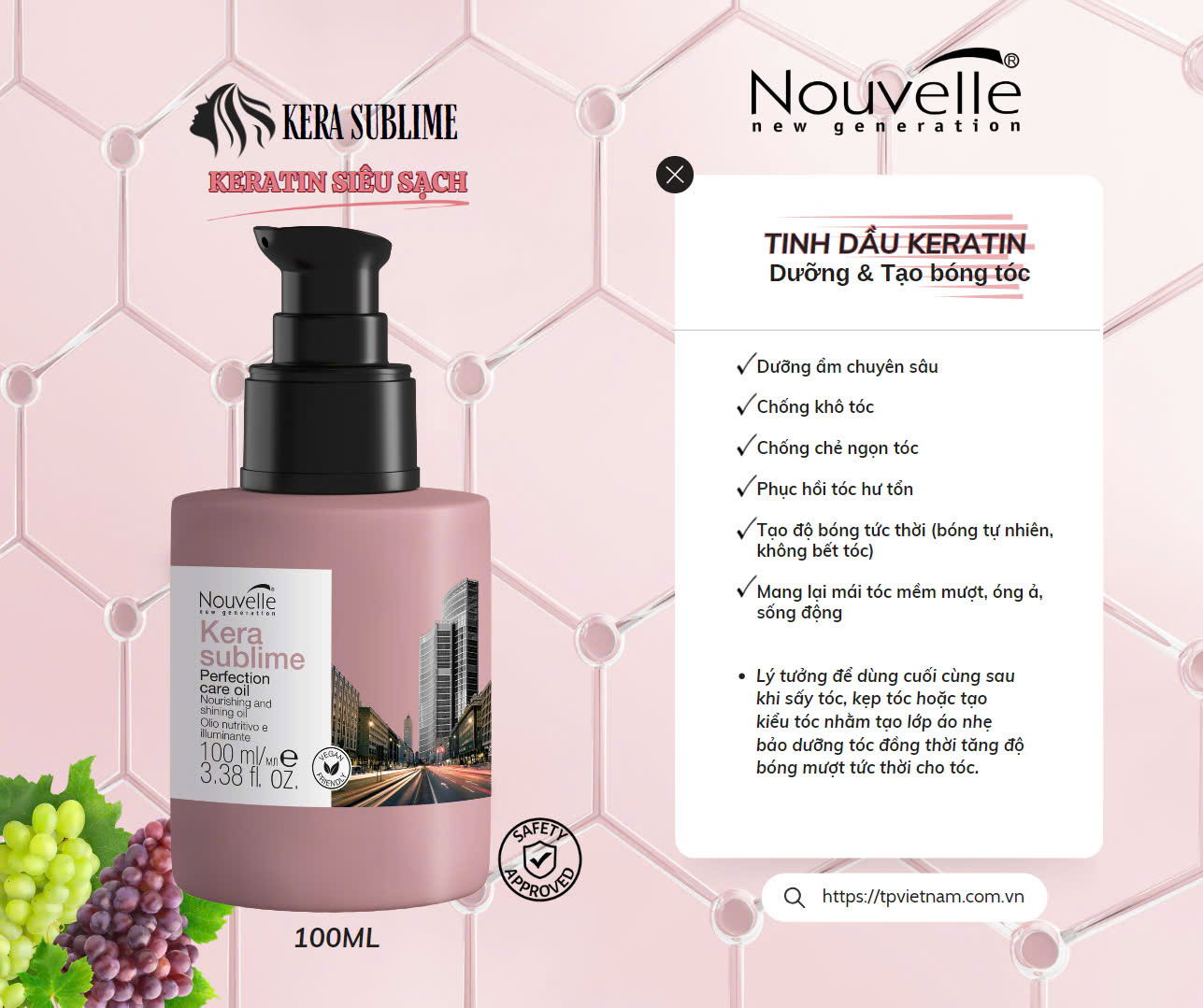 Công dụng:Với công thức tiên tiến chứa các thành phần có nguồn gốc thiên nhiên đặc biệt là các dưỡng chất chiết xuất từ hạt nho giúp tóc cân bằng độ ẩm, mềm mượt và óng ả. Sử dụng tinh dầu vào bước cuối cùng sau khi sấy kẹp tạo kiểu tóc để tạo lớp áo nhẹ bảo dưỡng tóc đồng thời tăng độ bóng cho tóc. Tinh dầu mang lại mái tóc bóng mượt tự nhiên, không bết tóc. Cách sử dụng:Sử dụng trên tóc khô. Cho vài giọt tinh dầu ra lòng bàn tay, rồi xoa hai lòng bàn tay vào nhau, sau đó vuốt 2 lòng bàn tay lên tóc. Dung tích: 100ml