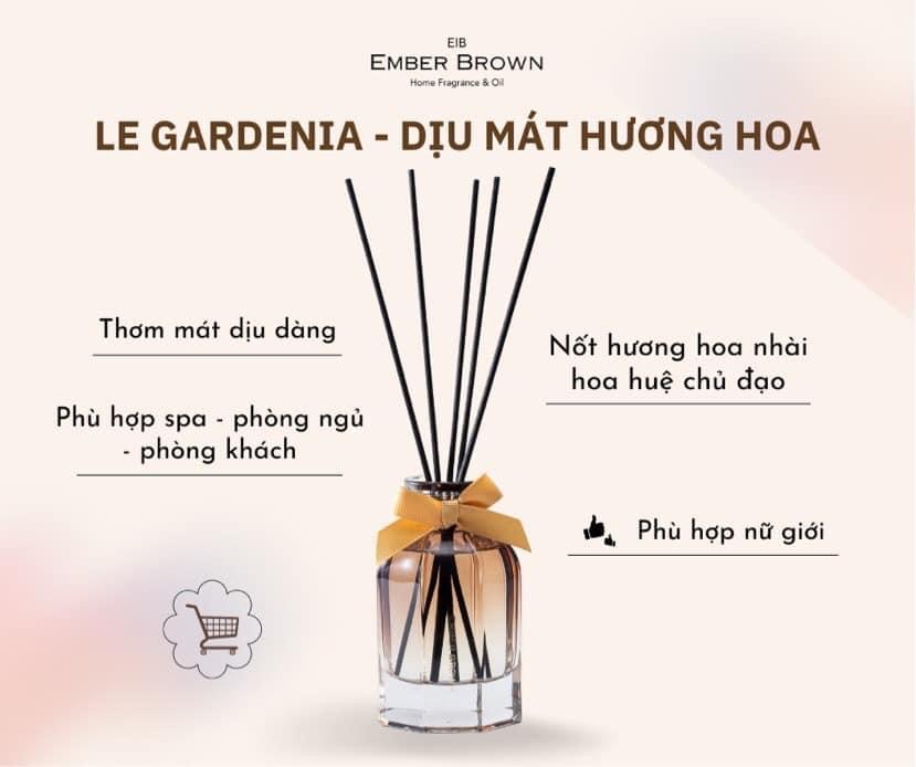 EMBER BROWN NƠ VÀNG (le gardenia) Lấy cảm hứng từ hương nước hoa nổi tiếng . Le Gardenia phiên bản nơ vàng dành cho những khách hàng yêu thích sự dịu dàng, tao nhã, tinh tế. Hương thơm sẽ đưa bạn đến một vườn hoa đầy những sắc hương hoa nhài, hoa huệ, cây kim ngân quyến rũ. Đây là nhóm hương giúp không gian thêm năng lượng, thoải mái.