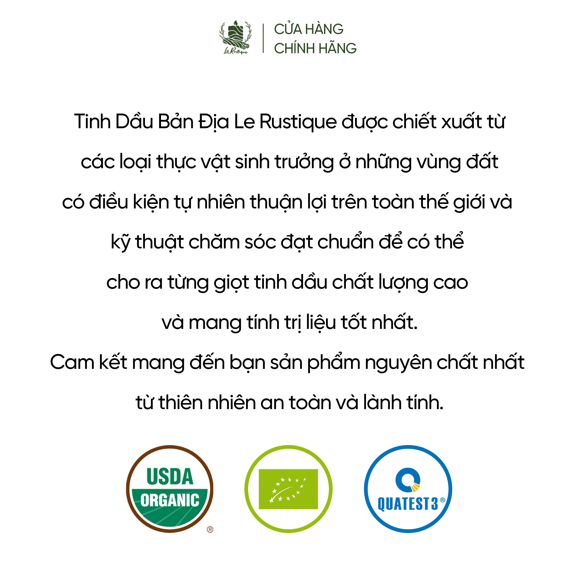 • Thận trọng (nếu dùng trên da): Đối với người có da quá nhạy cảm, bị bệnh hoặc bị tổn thương, người đang sử dụng thuốc được chuyển hóa bởi CYP2B6 và trẻ em dưới 15 tuổi. (*) Các thông tin được tổng hợp từ sách Essential Oil Safety: A Guide for Health Care Professionals, tái bản lần 02 năm 2014 của tác giả Robert Tisserand và Rodney Young.   ► CAM KẾT: Le Rustique Việt Nam cam kết sản phẩm đúng như hình. ➢ Trường hợp nhận hàng mà không đúng mô tả, sai số lượng, nhầm hàng hoặc hàng bể vỡ trong quá trình vận chuyển... Nhắn tin ngay cho shop TRONG VÒNG 24H sau khi nhận hàng để được giải quyết và hỗ trợ nhé. ➢ Khi nhận hàng, vui lòng quay VIDEO MỞ HÀNG để bảo đảm quyền lợi nếu có sai sót và hỗ trợ giải quyết vấn đề cho bạn nhanh nhất có thể.