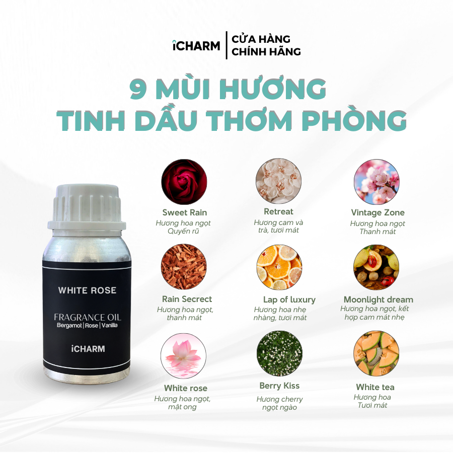 Xông phòng: Dùng với máy tạo mùi thơm để khuếch tán hương thơm ra ngoài không gian một cách nhanh chóng. Khử mùi hiệu quả với tinh dầu khách sạn, nước hoa iCHARM.