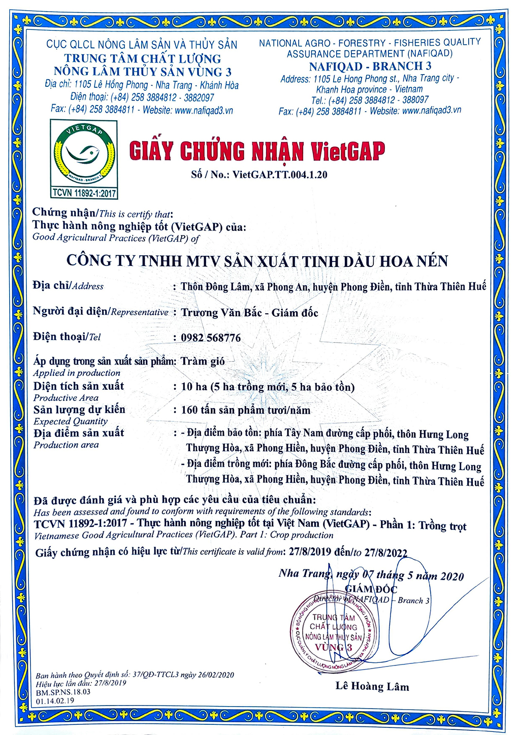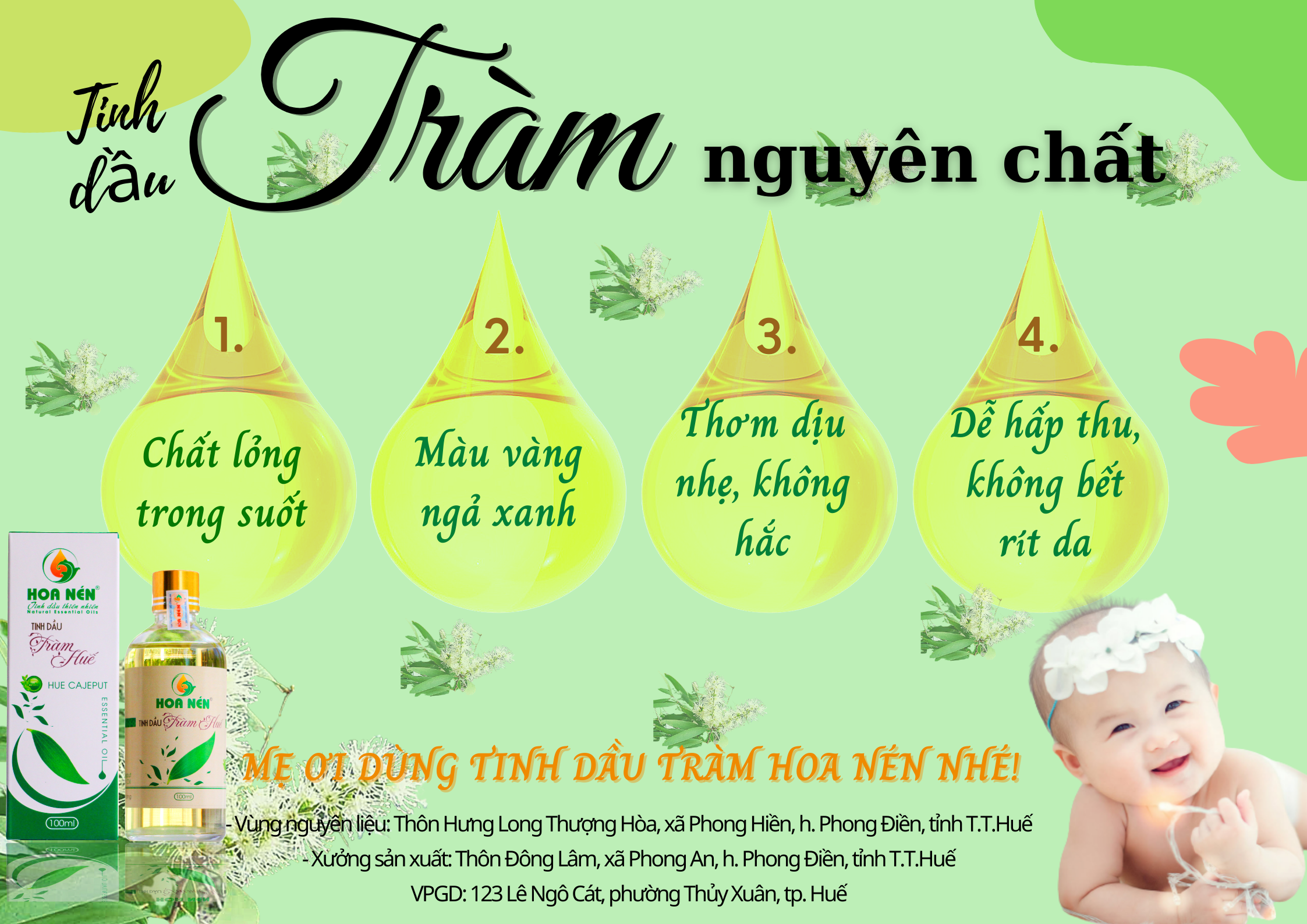 Sản phẩm Tinh dầu tràm của Công ty TNHH MTV Sản xuất Tinh dầu HOA NÉN, được chiết xuất từ 100% cây tràm gió thiên nhiên. Thành phần chính trong tinh dầu tràm là cineol 1,8 (hay còn gọi eucalyptol) và α-Terpineol. Cineol >40% có tác dụng long đờm, giảm ho, giữ ấm; α-Terpineol (5 - 12%) có khả năng kháng khuẩn tốt.
