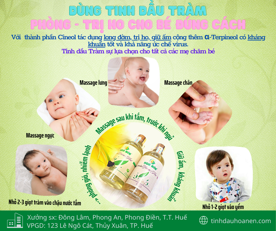 - Tinh dầu tràm phòng, giảm ho, khò khè, long đờm: Dùng tinh dầu tràm thoa vào lưng (tránh thoa trực tiếp vào xương cột sống trẻ) giúp cơ thể trẻ ấm lên một cách tự nhiên và giữ ấm lúc về đêm. Khi trẻ bị lạnh, ho thường có triệu chừng xổ mũi, nghẹt mũi, thở dốc dẫn đến kém ăn, mất ngủ. Cho ít tinh dầu tràm vào khăn sữa rồi quàng vào cổ của bé; để trước mũi cho bé hít vào (không bôi trực tiếp lên mũi) hoặc nhỏ một vài giọt tinh dầu tràm vào gối nằm của trẻ, thoa vào 2 gan bàn chân trước lúc ngủ giúp bé không bị lạnh. Dùng tinh dầu tràm để xông họng, hít mũi, sử dụng đèn xông tinh dầu, máy khuếch tán sẽ giúp bé lưu thông mũi dễ dàng. Tinh dầu tràm có tác dụng làm tan đàm nhớt, giảm ho hiệu quả và dần dần dứt hẳn ho.