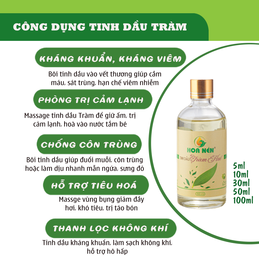 Mua tại TiktokCÔNG DỤNG VÀ HƯỚNG DẪN SỬ DỤNG CỤ THỂ TINH DẦU TRÀM – HOA NÉN Từ xưa đến nay, tinh dầu tràm nguyên chất được xem là biệt dược thiên nhiên rất tốt cho trẻ nhỏ, trẻ sơ sinh, phụ nữ mang thai và sản phụ. Với đặc tính không nóng, không gây phản ứng phu, không chống chỉ định, tinh dầu tràm được nhiều người lựa chọn trong tủ thuốc của gia đình. Tác dụng nổi bật nhất của tinh dầu tràm là phòng ho, tránh gió, trừ cảm mạo, đầy hơi.