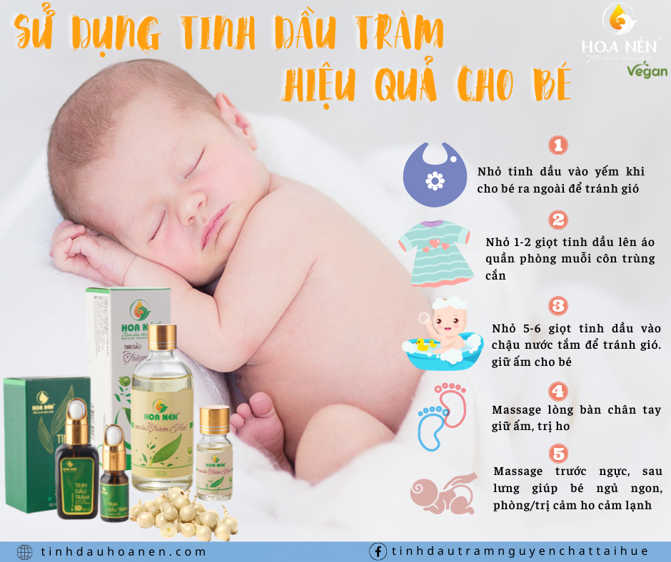 CÔNG DỤNG VÀ HƯỚNG DẪN SỬ DỤNG CỤ THỂ TINH DẦU TRÀM – HOA NÉN Từ xưa đến nay, tinh dầu tràm nguyên chất được xem là biệt dược thiên nhiên rất tốt cho trẻ