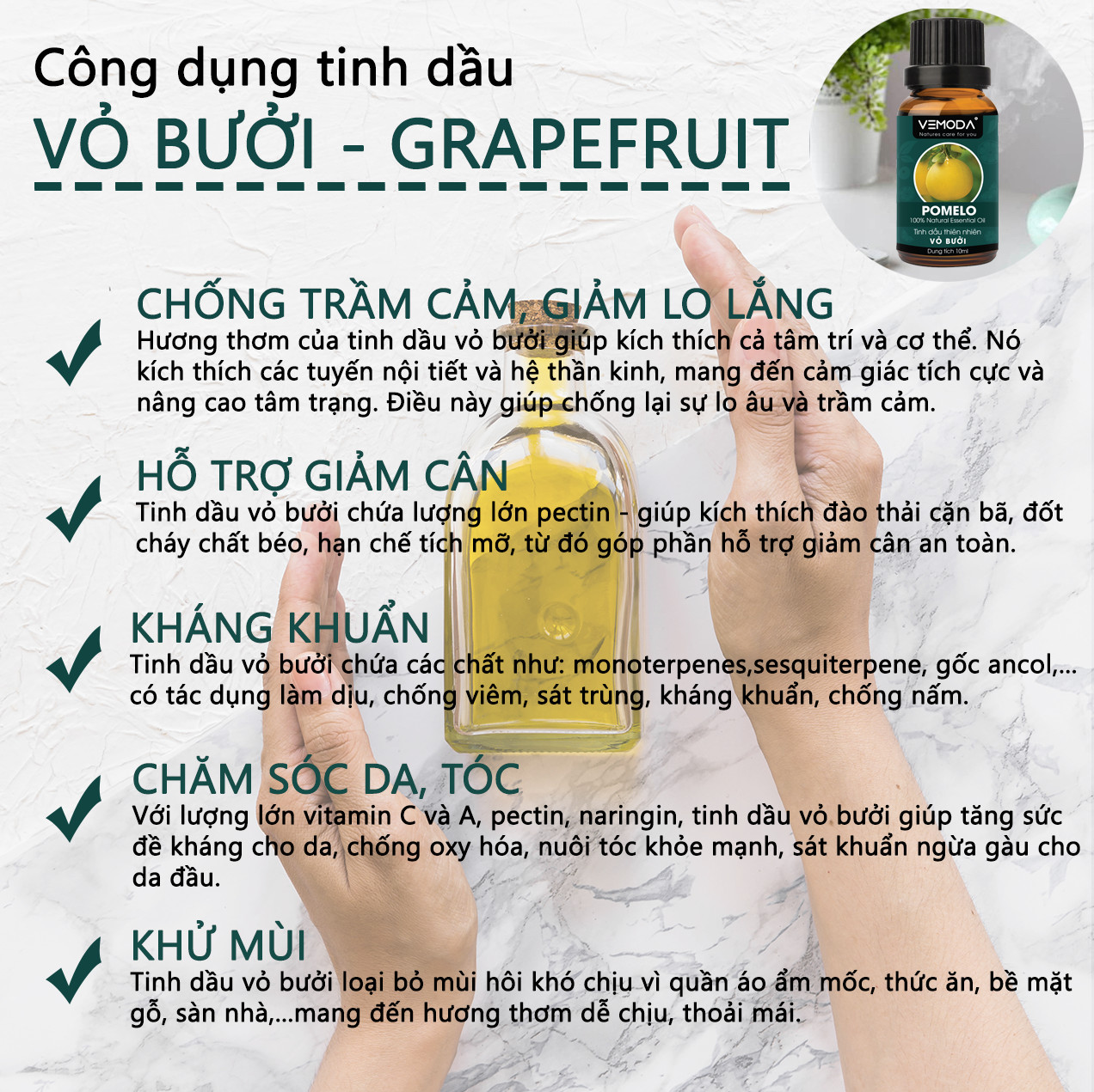 - Tinh dầu Vỏ bưởi MG: tạo cảm giác vui vẻ, tăng cường năng lượng, tăng cảm xúc thăng hoa, khử mùi, thanh lọc không khí, đuổi muỗi, massage, hỗ trợ chữa ngạt mũi, giải cảm, chăm sóc tóc, tắm, ủ thơm quần áo, khử mùi hôi chân.