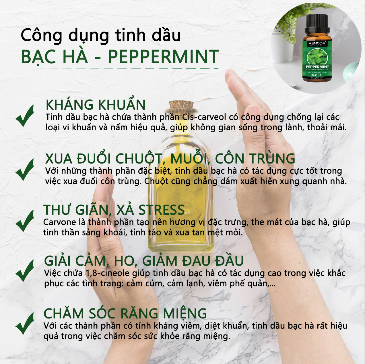 TINH DẦU BẠC HÀ CAO CẤP VEMODA 10ML Tinh dầu Bạc hà cao cấp VEMODA giúp thư giãn, kháng khuẩn, giải cảm, xua đuổi côn trùng, chăm sóc răng miệng Tinh dầu Bạc hà cao