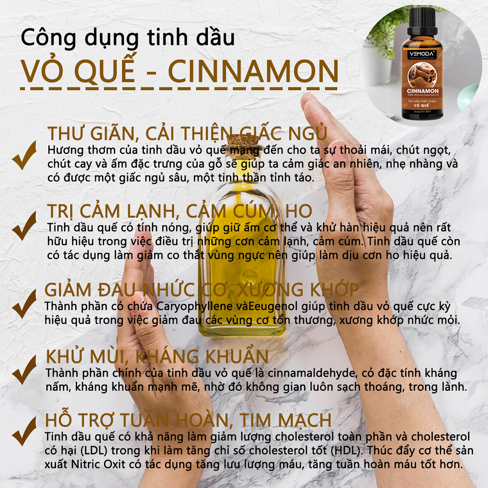 - Tinh dầu Vỏ quế: cân bằng tinh thần thoải mái, giảm căng thẳng, tạo giấc ngủ sâu. Khả năng sát trùng, khử khuẩn, ngắt cơn ho, long đờm, kích thích tiêu hóa, tăng lưu thông tuần hoàn, giảm sưng tấy, đau cơ khớp, đau mỏi vai gáy. Khử mùi hiệu quả.