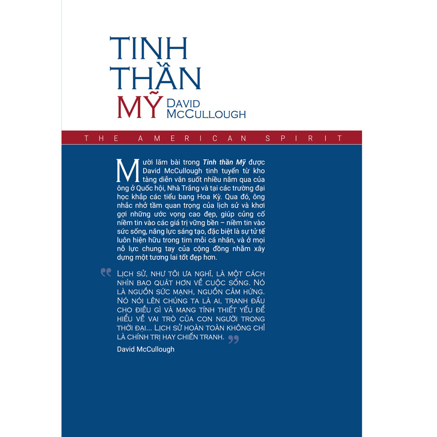 Mười lăm bài trong Tinh thần Mỹ được David McCullough tinh tuyển từ kho tàng diễn văn suốt nhiều năm qua của ông ở Quốc hội, Nhà Trắng và tại các trường đại học khắp các tiểu bang Hoa Kỳ. Qua đó, ông nhắc nhở tầm quan trọng của lịch sử và khơi gợi những ước vọng cao đẹp, giúp củng cố niềm tin vào các giá trị vững bền – niềm tin vào sức sống, năng lực sáng tạo, đặc biệt là sự tử tế luôn hiện hữu trong tim mỗi cá nhân, và ở mọi nỗ lực chung tay của cộng đồng nhằm xây dựng một tương lai tốt đẹp hơn.