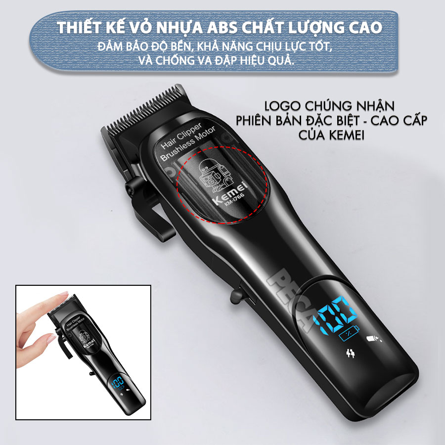 TÔNG ĐƠ CẮT TÓC CHUYÊN NGHIỆP KEMEI KM-1766 CÔNG SUẤT MẠNH 5W  ĐỘNG CƠ KHÔNG CHỔI THAN, MÀN HÌNH LCD HIỂN THỊ SẠC, LƯỠI CẮT MẠ CARBON DLC CAO CẤP     ƯU ĐIỂM NỔI BẬT :   1/ Ngoại quan sản phẩm: Máy có kiểu dáng thon gọn với kích thước phù hợp, giúp người dùng dễ dàng cầm nắm và thao tác một cách thoải mái, vân rãnh chống trượt thao thác dễ dàng không bị mỏi   Vỏ máy được làm từ nhựa ABS chất lượng cao, đảm bảo độ bền, khả năng chịu lực tốt, và chống va đập hiệu quả. Tăng đơ cắt tóc KM-1766 là phiên bản cao cấp của hãng Kemei, với phần logo chứng nhận phiên bản cao cấp được in ấn lên trên sản phẩm. 2/ Lưỡi cắt sản phẩm: Lưỡi cắt của Kemei KM-1766 được làm từ thép không gỉ cao cấp mạ carbon, đảm bảo độ sắc bén và bền bỉ theo thời gian.   Phía sau phủ lớp mạ carbon: Vậy lưỡi mạ carbon là lưỡi gì?  Carbon: Là lớp phủ Nanocomposite có tính chất độc đáo của kim cương giúp lưỡi sở hữu: độ cứng cao, cắt sắc bén, ít nóng... Lớp mạ này sẽ cho ra màu sắc đen đặc trưng và có ưu điểm là siêu cứng (chỉ sau kim cương), bền bỉ, chống xước tốt, chống va đập, luôn sáng bóng.