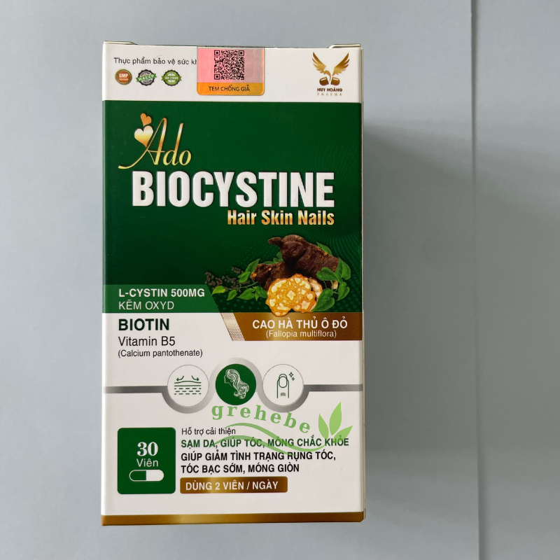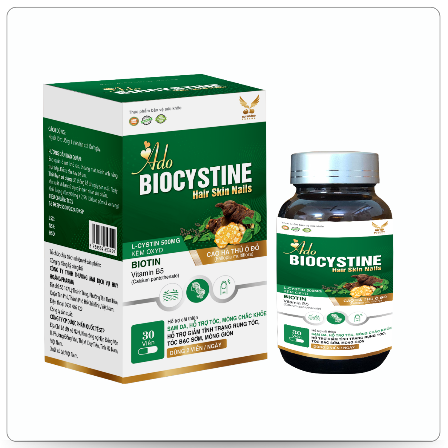 Ado Biocystine chứa Biotin, L-cystin, vitamin B5, kẽm oxyd,… hỗ trợ cải thiện sạm da, giúp tóc, móng chắc khỏe, giúp giảm tình trạng rụng tóc, tóc bạc sớm, móng giòn. TRONG SẢN PHẨM ADO BIOCYSTINE CÓ