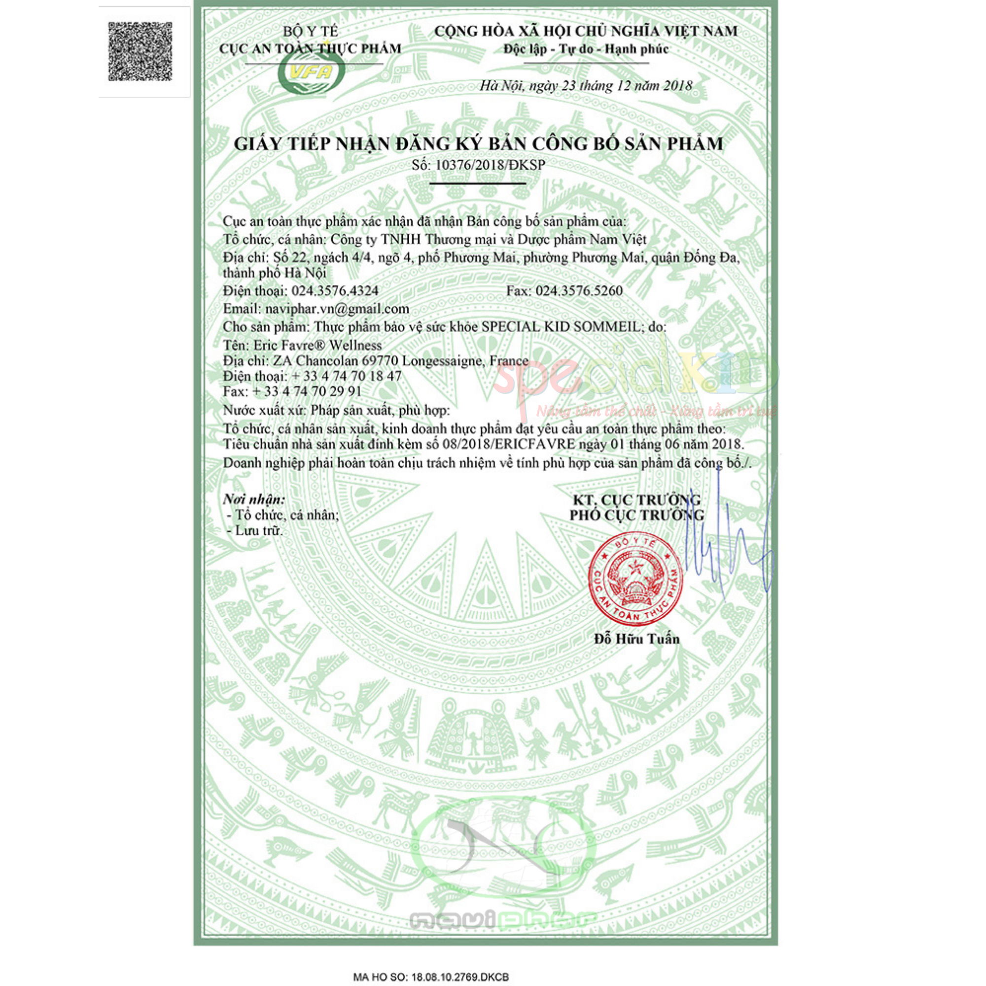Siro giúp ngủ ngon cho bé, an giấc, giảm giật mình, cân bằng giấc ngủ sinh lý cho trẻ TPBVSK Special Kid Sleep / Special Kid Sommeil 125ml [Nhập khẩu - Pháp] Special Kid là thương hiệu nhập khẩu nguyên hộp từ Pháp, đáp ứng hầu hết nhu cầu phòng và hỗ trợ điều trị các bệnh thường gặp của trẻ trong những năm tháng đầu đời. Special Kid Sommeil được bào chế chuyên biệt dành cho trẻ em, mùi vị dễ chịu, chỉ cần sử dụng 1 lần/ngày. Tiết kiệm. Dễ nhớ Công dụng : Hỗ trợ an thần kinh. Giúp trẻ ngủ ngon giấc. Đối tượng sử dụng : Trẻ em khó ngủ, ngủ chập chờn, mất ngủ, ngủ không ngon giấc Hướng dẫn sử dụng : Trẻ em dưới 24 tháng tuổi : Sử dụng theo hướng dẫn của Bác sỹ. Trẻ dưới 5 tuổi : Uống 5ml (1 thìa cà phê) mỗi ngày vào buổi tối. Trẻ trên 5 tuổi : Uống 10ml (2 thìa cà phê) mỗi ngày vào buổi tối. Lắc kỹ trước khi dùng. Có thể uống trực tiếp hoặc pha loãng với nước hay nước giải khát khác. Giá trên đã bao gồm thuế giá trị gia tăng theo luật định. Sản phẩm không phải là thuốc, không có tác dụng thay thế thuốc chữa bệnh. Thông tin sản phẩm : Đóng gói : Chai / Hộp Mùi hương : Vị ngọt chua nhẹ Hương dâu rừng Dung tích : Chai 125ml Xuất xứ : Pháp Thành phần : Thành phần trong 10ml: Dịch chiết Humulus lupulus/ Hoa bia ……… 1.000 mg Dịch chiết Lavandula angustifolia/ Oải hương ……… 1.000 mg Dịch chiết Melissa officinalis/ Tía tô đất ……… 1.000 mg Dịch chiết Citrus sinensis/ Cam ……… 1.000 mg Dịch chiết Tilia platyphyllos/ Đoạn ……… 1.000 mg Dịch chiết Aloysia citrodora/ Cỏ roi ngựa ……… 1.000 mg Nhập khẩu & phân phối : Công ty TNHH TM và DP Nam Việt