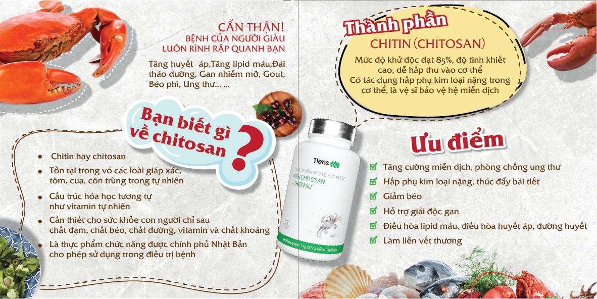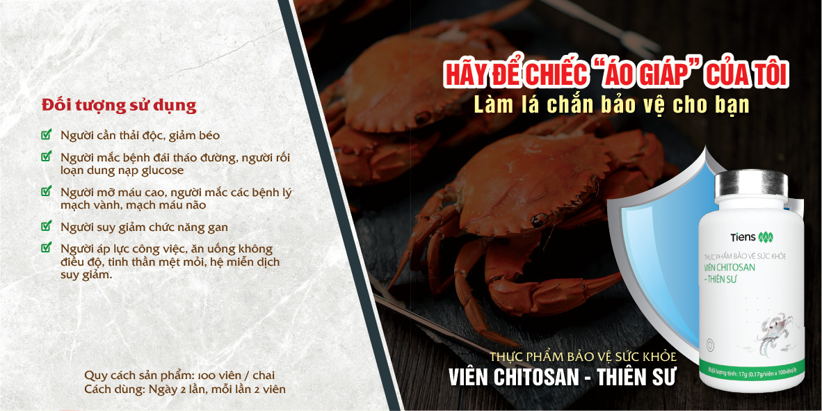 TPBVSK Viên Chitosan - Thiên Sư Quy cách: 17g (0,17g x 100 viên)/ lọ. Thành phần: Bột chitosan (chiết xuất từ vỏ cua) 82%: 170mg Công dụng: Hỗ trợ tăng sức đề kháng cơ thể, giảm hấp thụ chất béo, giảm nguy cơ béo phì Đối tượng thích hợp: Người sức đề kháng kém, khả năng miễn dịch kém, những người béo phì, mỡ máu cao.  Cách dùng: Mỗi ngày uống 2 lần, mỗi lần 2 viên với nước ấm.  Bảo quản nơi khô ráo, thoáng mát, tránh ánh náng trực tiếp Xuất xứ: Việt Nam Thực phẩm này không phải là thuốc và không có tác dụng thay thế thuốc chữa bệnh. Không sử dụng cho người mẫn cảm với bất kỳ thành phần nào của sản phẩm Không nên dùng cho trẻ nhỏ Số CBSP: 11458/2020/ĐKSP Sản phẩm của Tiens nhận được rất nhiều chứng nhận của Việt Nam và Quốc tế về chất lượng sản phẩm như : Hala , FDA của Hoa Kỳ, Chứng nhận doanh nghiệp công nghệ cao, chứng nhận hệ thống quản lý an toàn thực phẩ