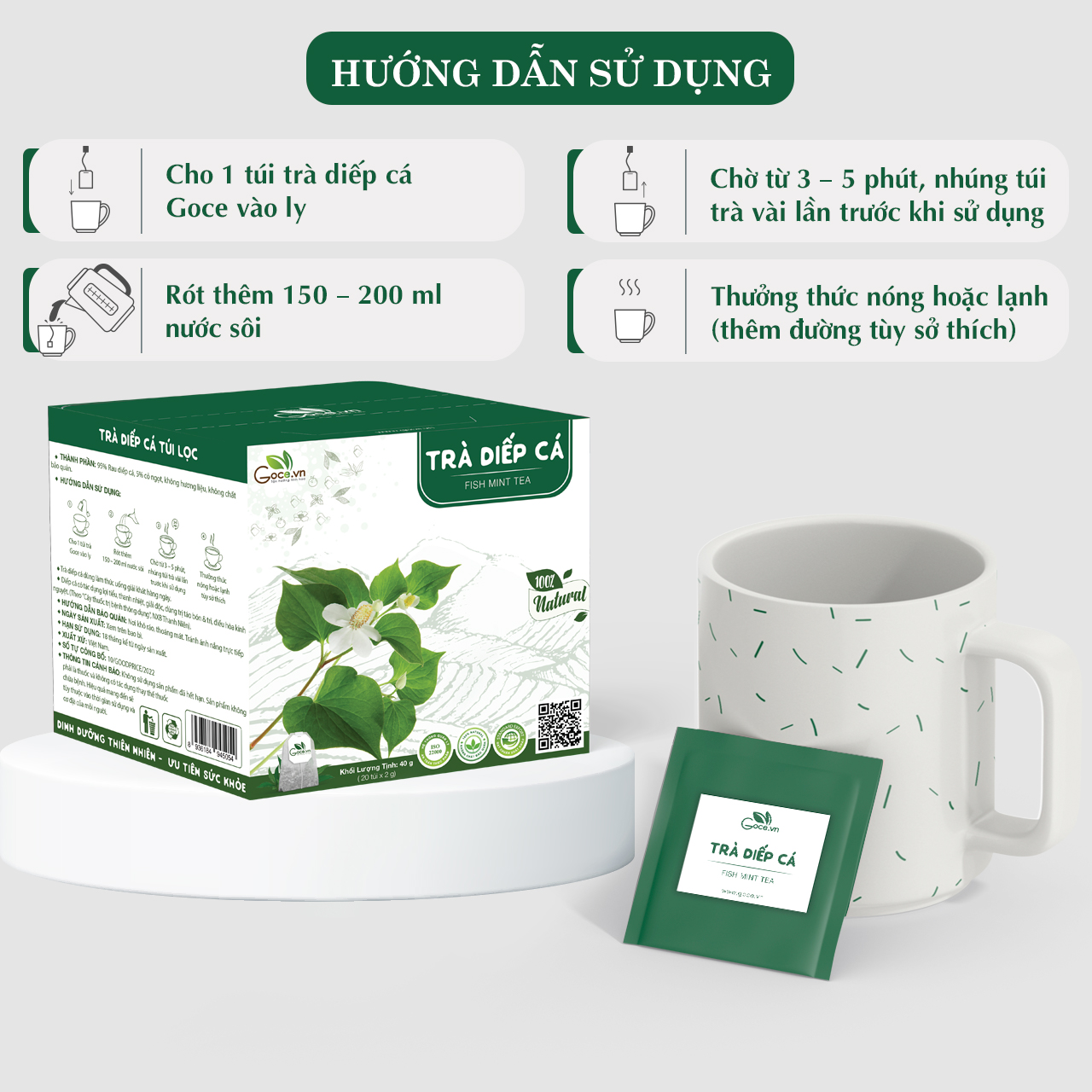 - NSX và HSD: Xem trên bao bì (18 tháng kể từ ngày sản xuất). Lưu ý: Không sử dụng sản phẩm đã hết hạn. Sản phẩm này không phải là thuốc và không có tác dụng thay thế thuốc chữa bệnh. Bảo quản: Nơi khô ráo, thoáng mát. Tránh ánh nắng trực tiếp. -------------------------------------------------------------- HƯỚNG DẪN SỬ DỤNG TRÀ DIẾP CÁ TÚI LỌC