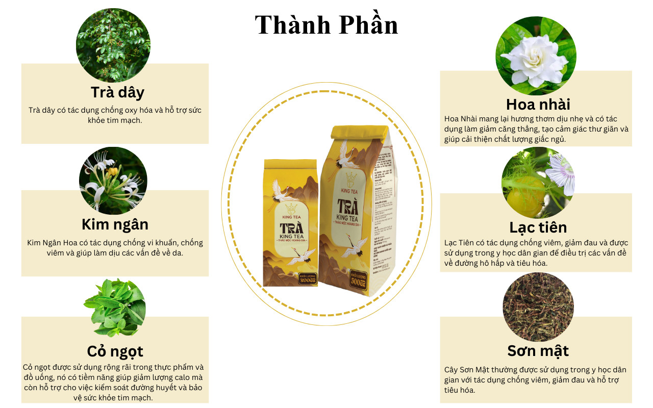 Trà Thảo Mộc Kingtea có thành phần gồm: Trà dây, Cỏ ngọt, Hoa nhài, Kim ngân hoa, Lạc tiên, sơn mật