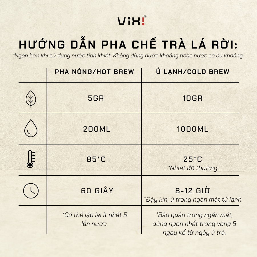 – Pha nóng: Rót 200ml nước sôi 85 độ C vào 5gr trà lá rời, ủ trong vòng 60 giây và thưởng thức.