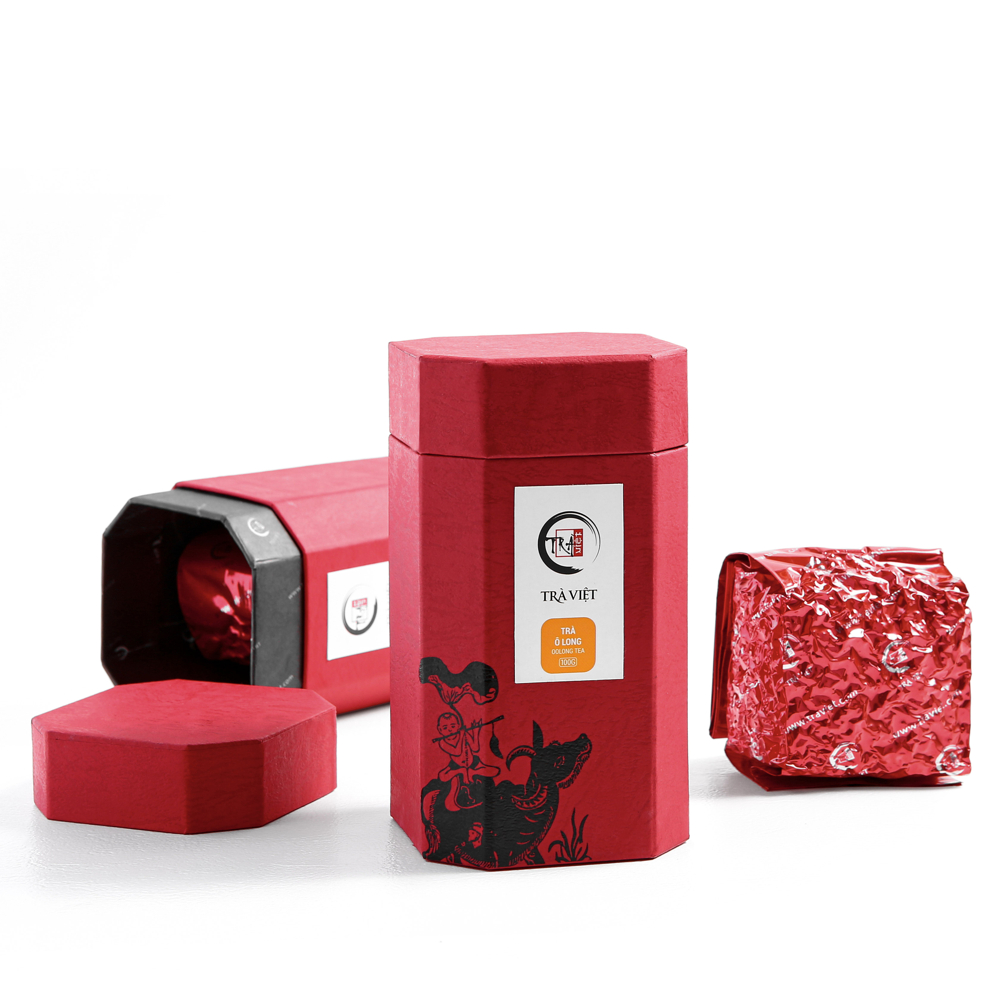 "Kích thước 20 cm x 20 cm x 9 cm, chất liệu giấy gân mỹ thuật màu đỏ, mặt trên in hoa văn Mục đồng thổi sáo, dán logo Trà Việt bằng giấy couche, bên