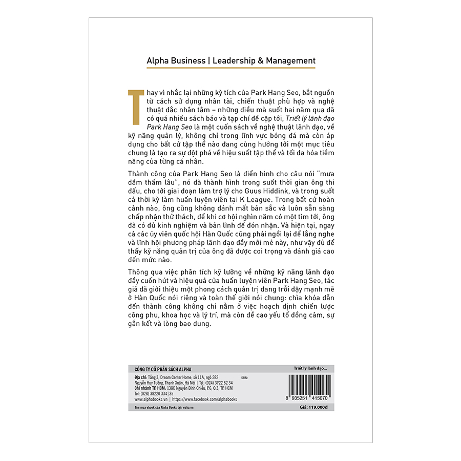 Thông qua việc phân tích kỹ lưỡng về những kỹ năng lãnh đạo đầy cuốn hút và hiệu quả của huấn luyện viên Park Hang Seo, tác giả đã giới thiệu một phong cách quản trị đang trỗi dậy mạnh mẽ ở Hàn Quốc nói riêng và toàn thế giới nói chung: chìa khóa dẫn đến thành công không chỉ nằm ở việc hoạch định chiến lược công phu, khoa học và lý trí, mà còn đề cao yếu tố đồng cảm, sự gắn kết và lòng bao dung.