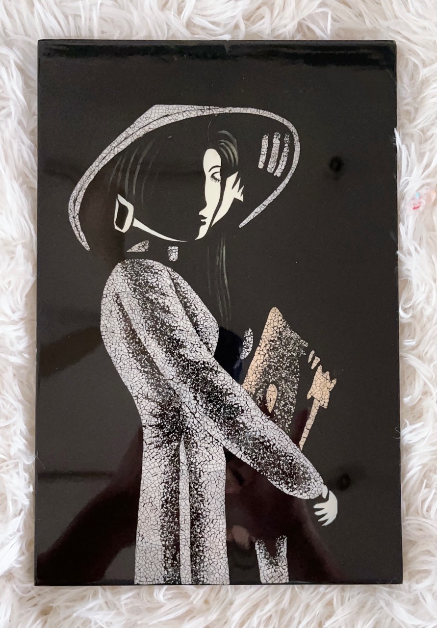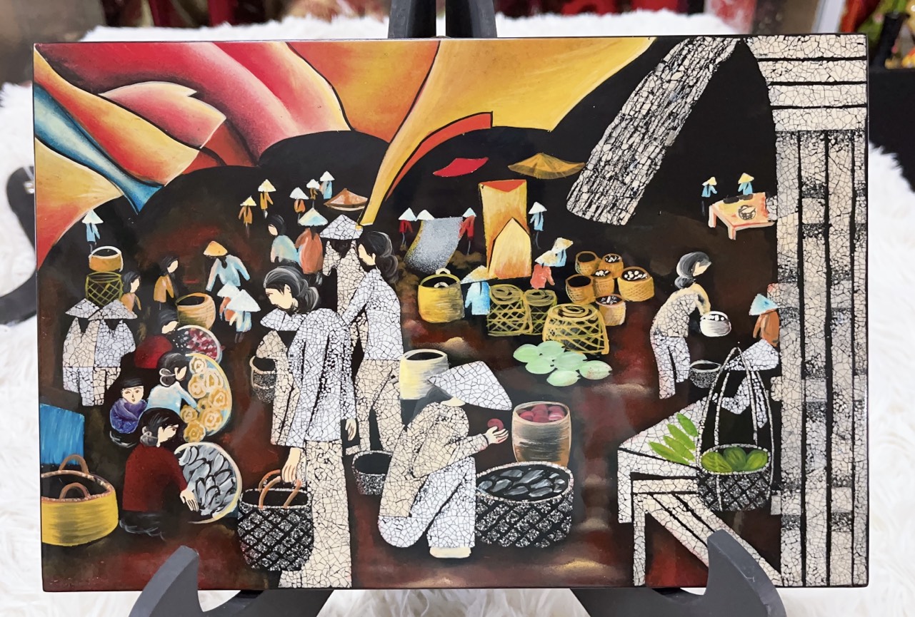 Tranh sơn mài cẩn vỏ trứng- cẩn chìm tặng khách nước ngoài là món quà tuyệt vời nhất, tà áo dài làm du khách liên tưởng đến những cô gái Việt Nam trong tà áo dài thướt tha, mềm mại như sự dịu dàng vốn có của con người hiền hòa nơi đây.