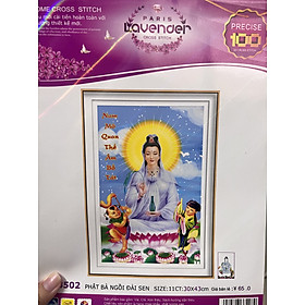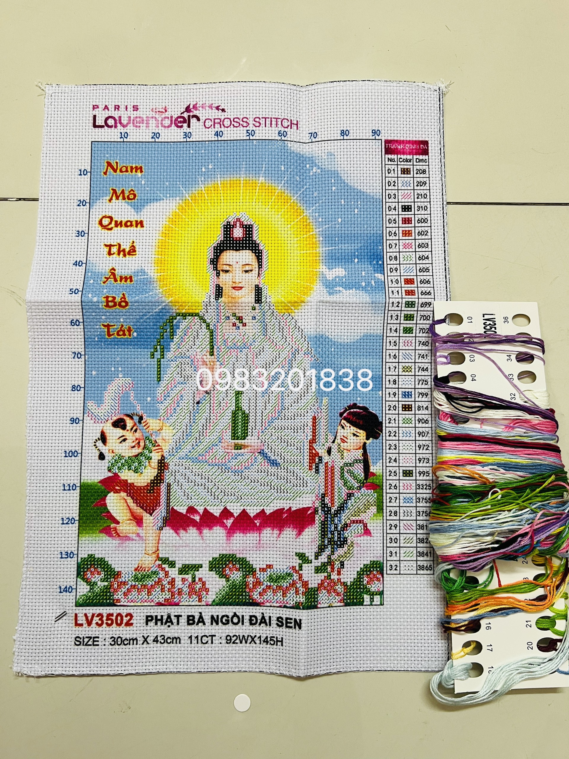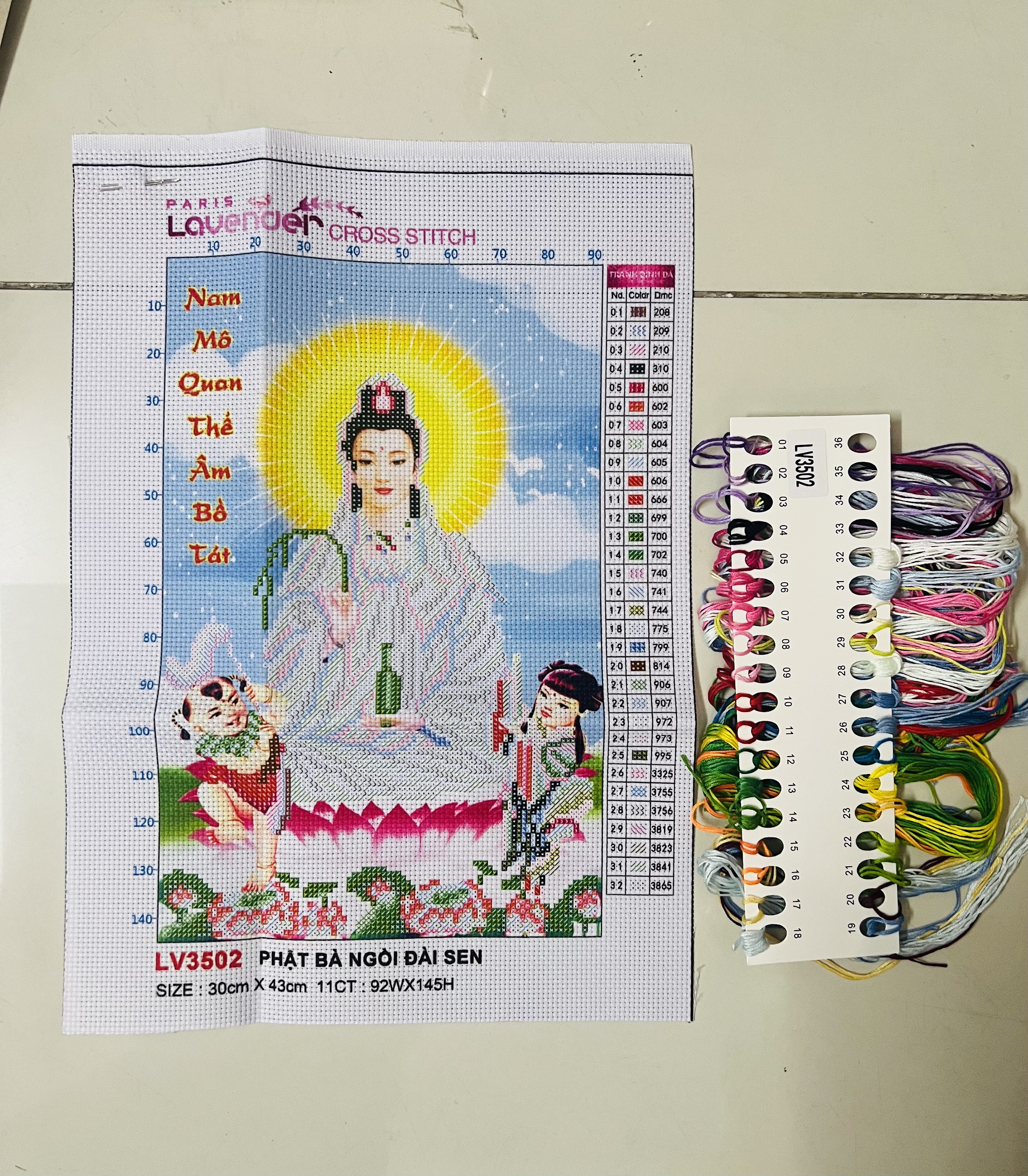 Tên tranh: Tranh thêu chữ thập Phật quan âm ngồi tòa sen LV3502