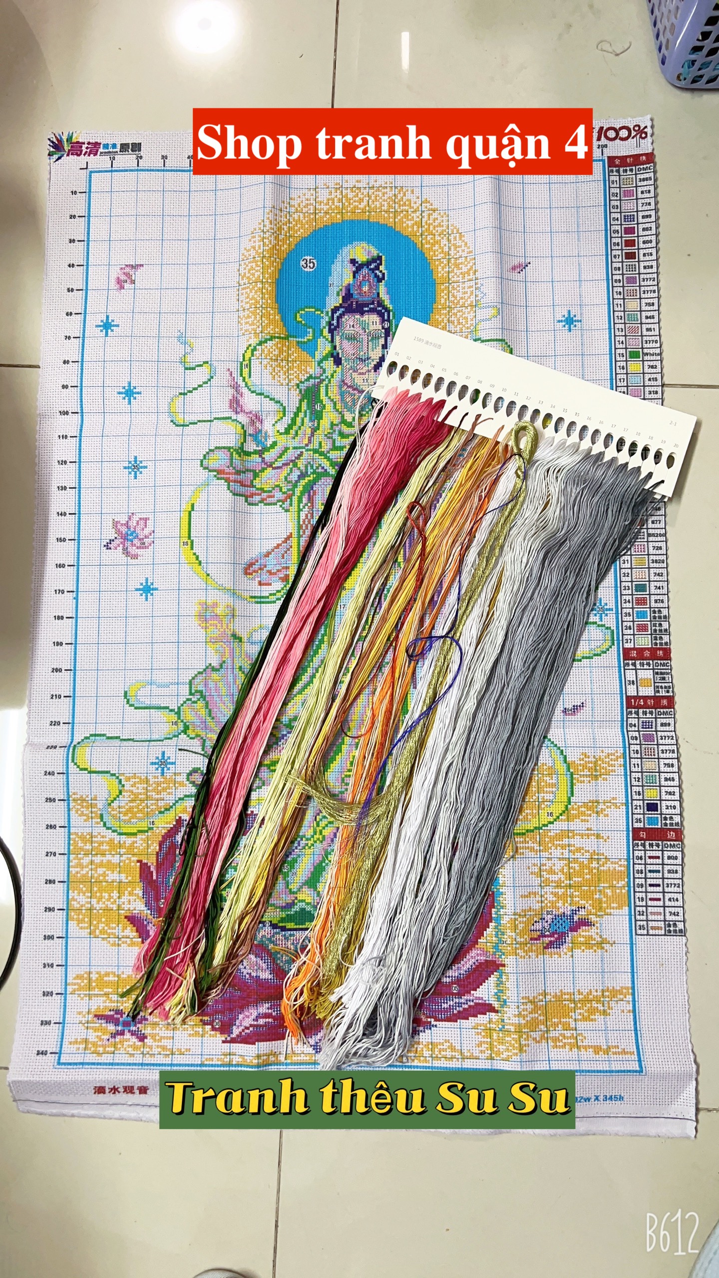 Shop bán đầy đủ các dụng cụ và phụ kiện thêu tranh như: Chỉ thêu lẻ theo tép, kim thêu, khung thêu, kéo, xỏ chỉ, sáp vuốt chỉ, kẹp nhựa, kẹp sắt….