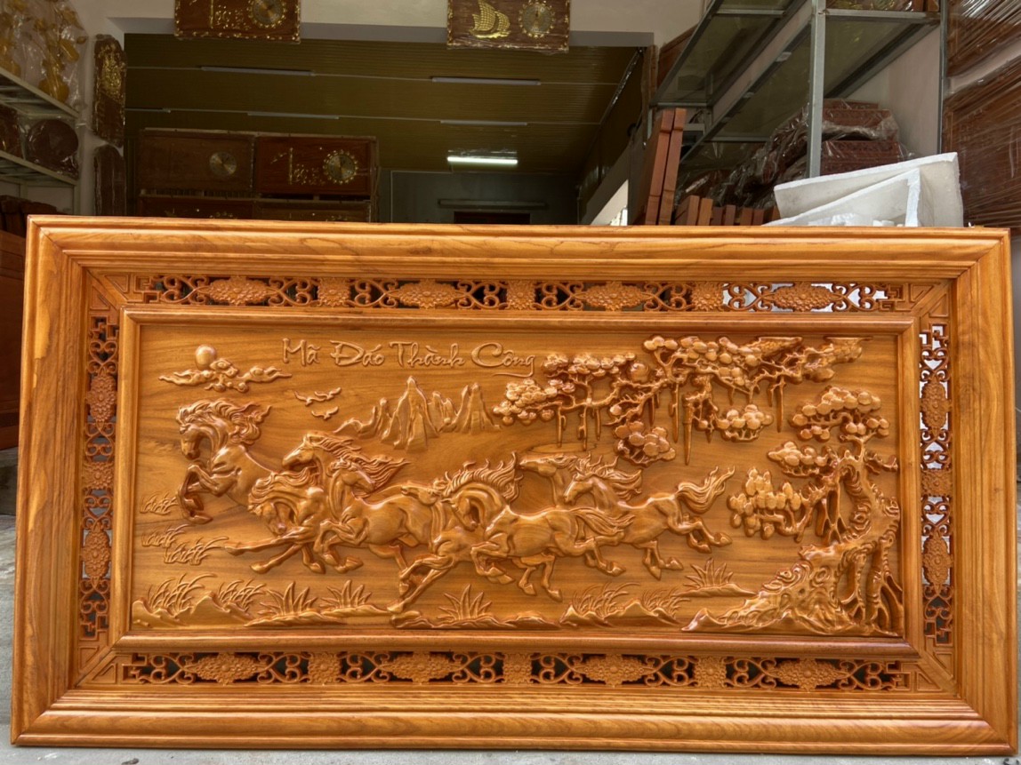 Tranh gỗ mã đáo thành công khung đục 1.27m