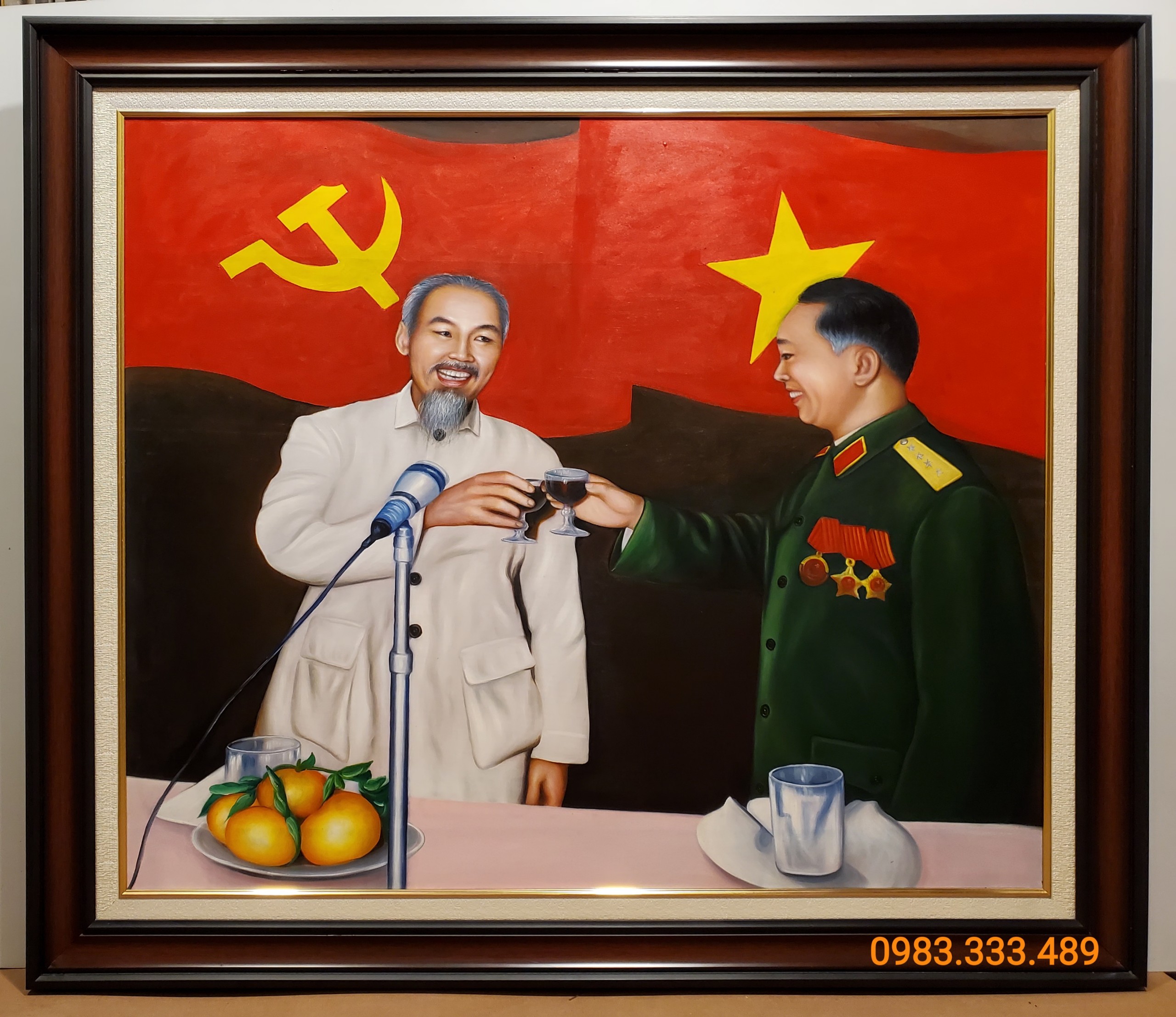 Tranh Vẽ sơn dầu Bác Hồ & Bác Giáp Tranh sơn dầu vẽ Đại tướng Võ Nguyên Giáp & Bác Hồ Chất liệu:Sơn dầu, vải toan, khung tranh màu vân gỗ composits cao cấp không