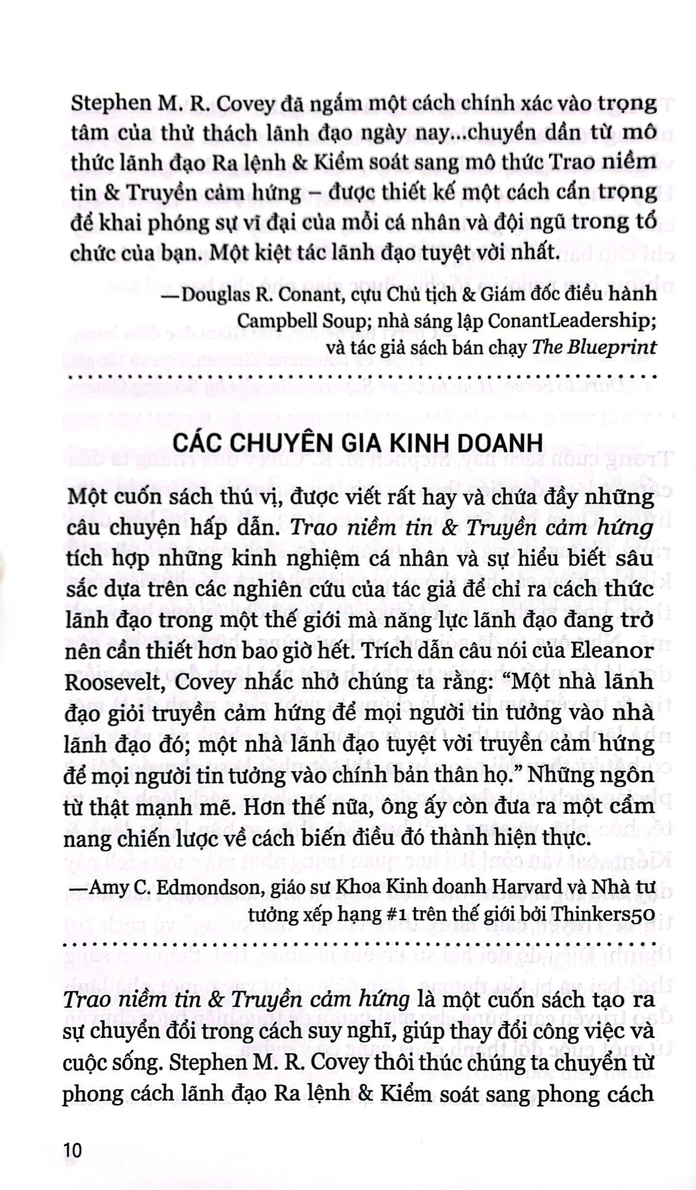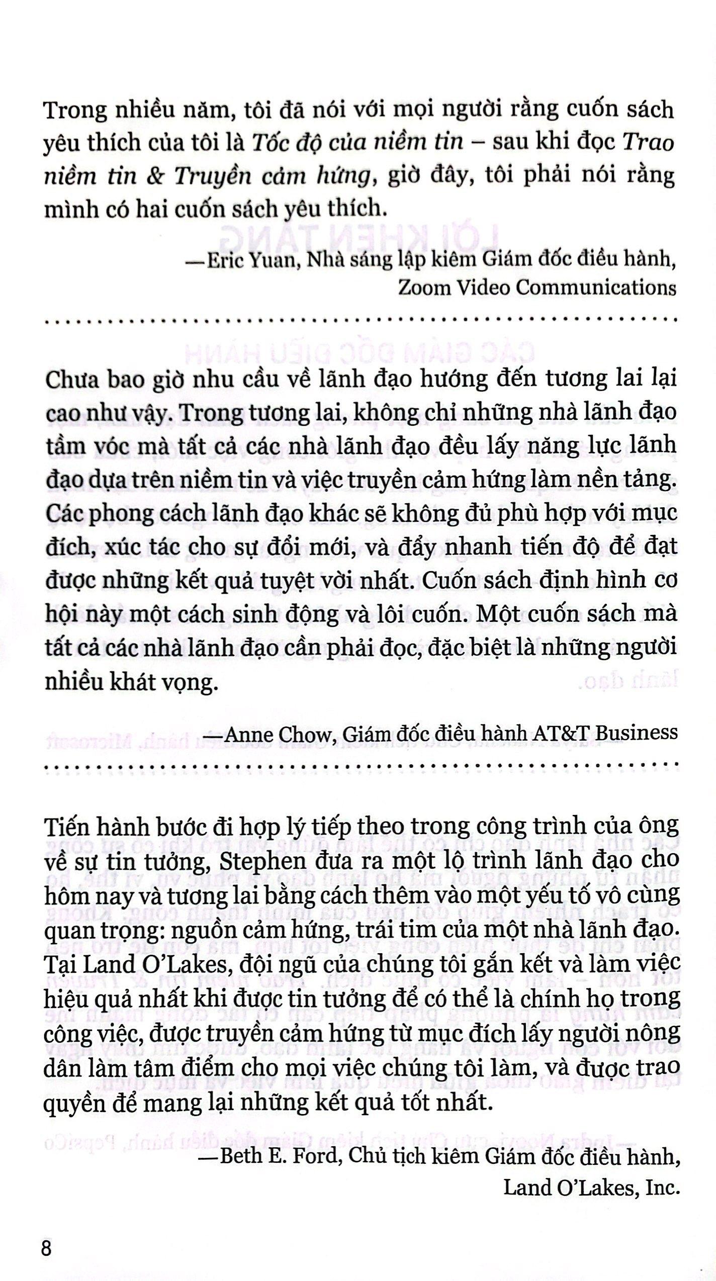 “Một cuốn sách thú vị, được viết rất hay và chứa đầy những câu chuyện hấp dẫn. “Trao niềm tin và Truyền cảm hứng” tích hợp những kinh nghiệm cá nhân và sự hiểu biết sâu sắc dựa trên các nghiên cứu của tác giả để chỉ ra cách thức lãnh đạo trong một thế giới mà năng lực lãnh đạo đang trở nên cần thiết hơn bao giờ hết.” - Amy Edmondson, giáo sư Khoa Kinh doanh Harvard và Tư tưởng gia quản trị số #1 trên thế giới bởi Thinkers50