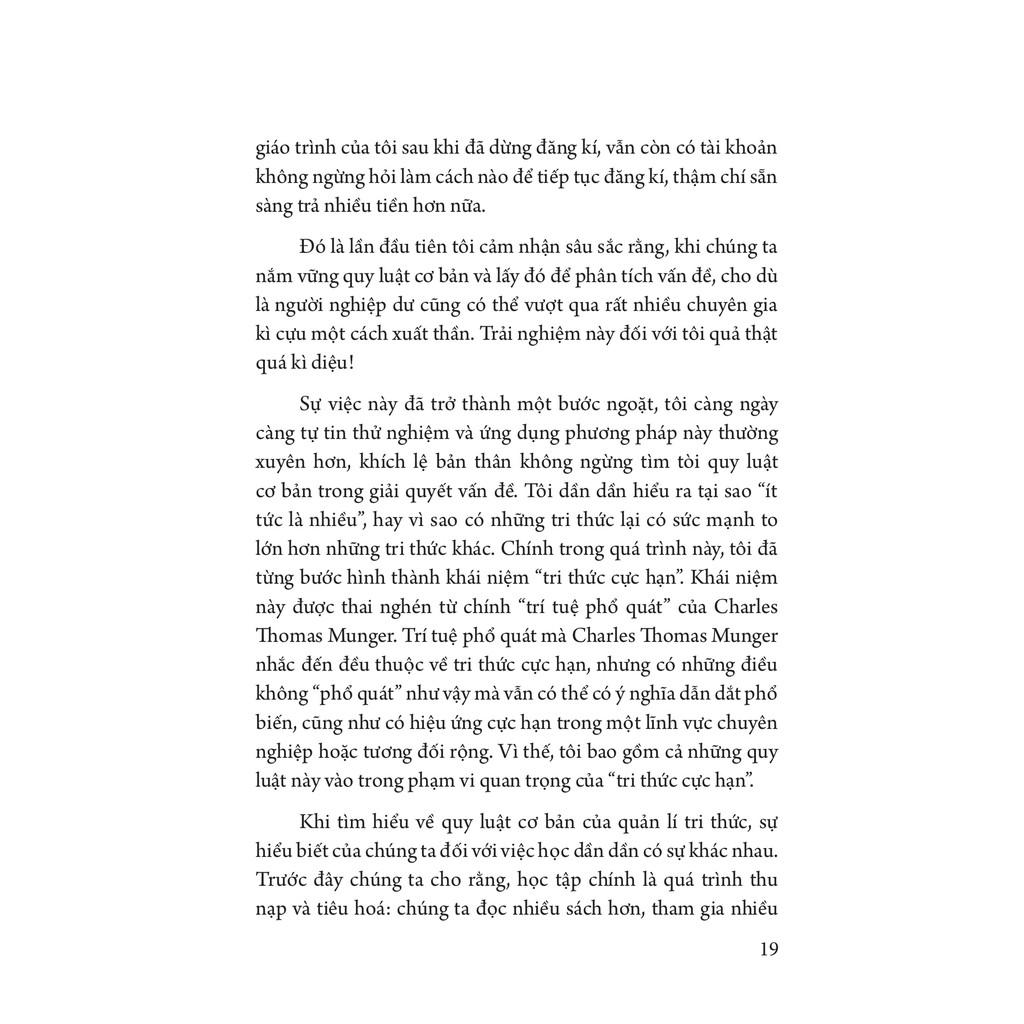 Có một vấn đề là phần lớn chúng ta dù biết đến những “tri thức cực hạn” nhưng khi gặp khó khăn vướng mắc lại bỏ qua, xem thường những quy luật cơ bản và phạm vào những sai lầm thông thường nhất. Chỉ những người thành công áp dụng những quy luật đó mới có thể đưa ra phán đoán chính xác, tìm ra cách thức để giải quyết mọi thử thách trong công việc và cuộc sống.