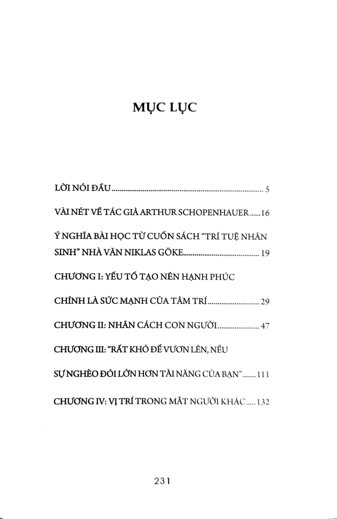 Trí Tuệ Nhân Sinh GIỚI THIỆU TÁC GIẢ: Arthur Schopenhauer, một trong những triết gia vĩ đại của nước Đức, nổi tiếng với những quan điểm đầy sáng tạo và phản biện sâu sắc về cuộc sống và nhân sinh. Ông được biết đến với việc khuyến khích một lối sống đơn giản, khổ hạnh và chay tịnh, mặc dù trong cuộc sống cá nhân ông lại thích ăn thịt, uống rượu vang và mê mẩn phụ nữ. Schopenhauer đã mở rộng và phát triển triết lý Kant về cách con người trải nghiệm thế giới, đặc biệt là trong việc khám phá sâu sắc về bản chất của khổ đau và sự vô ích trong cuộc sống. Triết gia này không chỉ nổi tiếng với sự độc lập tư tưởng mà còn với sự dám nghĩ, dám nói và sự sâu sắc về tâm lý con người, tạo nên dấu ấn sâu sắc trong lịch sử triết học thế giới. GIỚI THIỆU TÁC PHẨM: TRÍ TUỆ NHÂN SINH – CUỘC DẠO CHƠI CỦA MỘT “ĐỘC CÔ” GIỮA CUỘC ĐỜI. Trí Tuệ Nhân Sinh của Arthur Schopenhauer là một tác phẩm triết học sâu sắc về hạnh phúc và ý nghĩa cuộc sống. Trong cuốn sách này, Schopenhauer đề cập nhiều điều thú vị mà bạn đọc có thể chiêm nghiệm và tự rút ra cho mình những bài học quý giá. Ông cho rằng, những gì một người có ở bản thân mình, cùng với mục tiêu cuộc sống của anh ta, là yếu tố trực tiếp dẫn đến hạnh phúc và phúc lợi của người đó. Tất cả những thứ khác chỉ là trung gian và gián tiếp và ít bị ảnh hưởng. Schopenhauer lập luận, con người có thể dễ dàng chịu đựng một điều bất hạnh đến từ bên ngoài dễ dàng hơn là điều bất hạnh từ bên trong. Vận mệnh có thể thay đổi, nhưng tính cách thì không. Vì vậy, những phước lành từ chủ quan, một bản chất cao thượng, một cái đầu có năng lực, một tính khí vui vẻ, tinh thần trong sáng, một thể chất khỏe mạnh, là những yếu tố đầu tiên và quan trọng nhất của hạnh phúc. “Đừng nên kỳ vọng nhiều vào người khác, hay nói chung là đừng nên kỳ vọng từ thế giới bên ngoài” – như một châm ngôn đúng với bất kỳ ai! Chính bản thân mình là nguồn gốc của những điều tốt đẹp nhất mà con người có thể đạt được. Càng đúng hơn khi khẳng định – một người càng vui vẻ hạnh phúc hơn khi tìm thấy nguồn vui trong chính mình.
