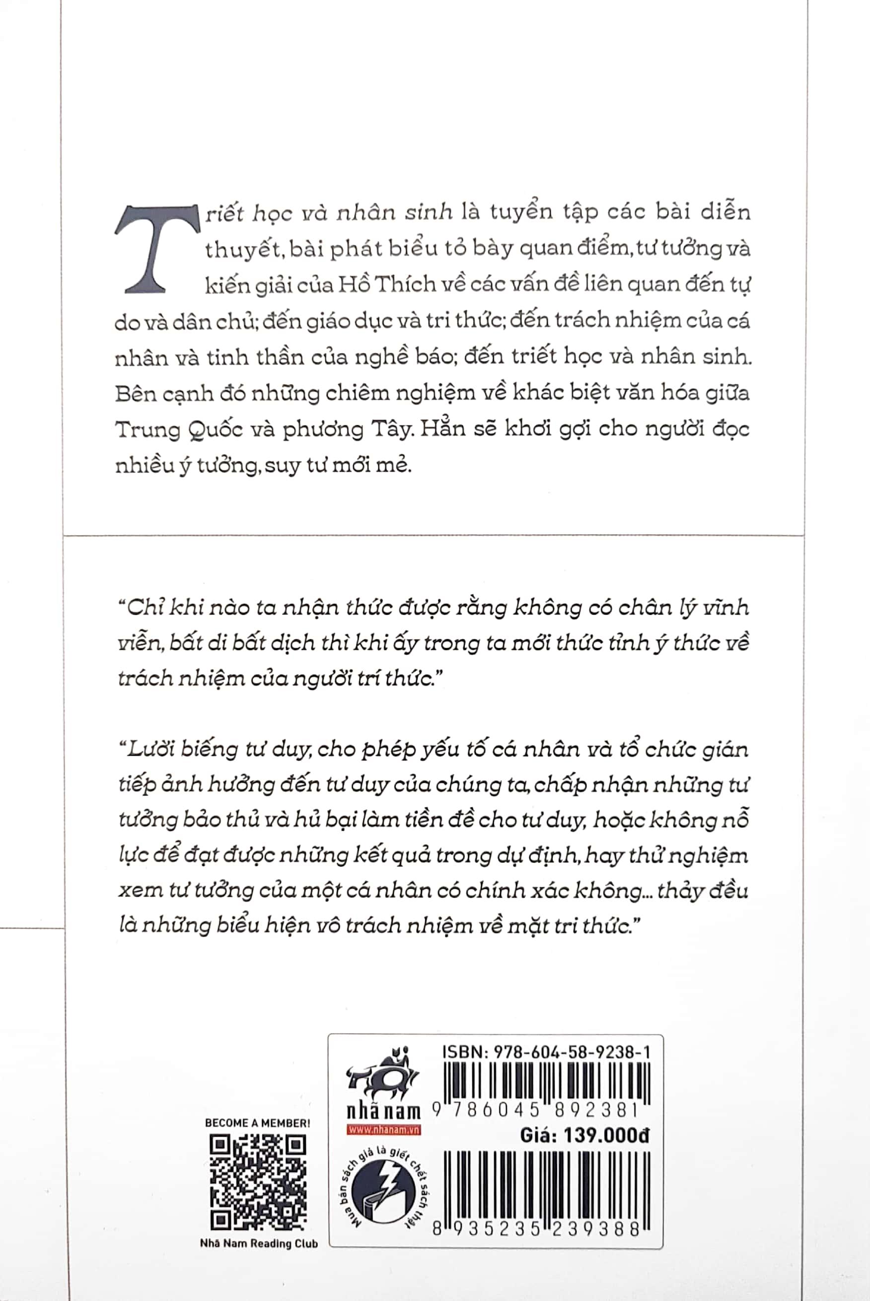 Mua tại TiktokTriết Học Và Nhân Sinh Triết học và nhân sinh là tuyển tập các bài diễn thuyết, phát biểu bày tỏ quan điểm, tư tưởng và kiến giải của Hồ Thích về các vấn đề liên quan đến tự do và dân chủ, giáo dục và tri thức, đến trách nhiệm của cá nhân và tinh thần của nghề báo, đến triết học và nhân sinh. Bên cạnh đó những chiêm nghiệm về khác biệt văn hóa giữa Trung Quốc và phương Tây hẳn sẽ khơi gợi cho người đọc nhiều ý tưởng, suy tư mới mẻ.