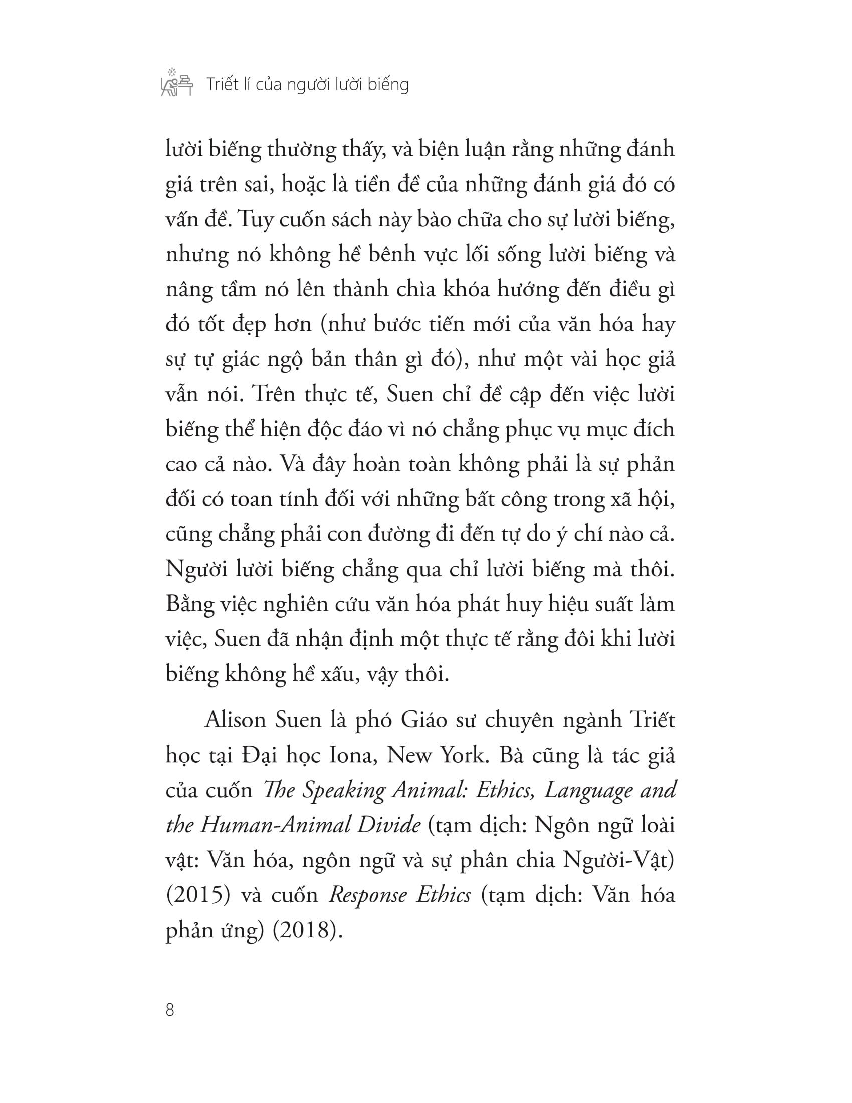 “Triết lí của người lười biếng” không phải là thứ xảo ngôn lý cùn phiến diện biện minh cho thói chây ì của một nhóm người cụ thể, mà là một phân tích triết học dựa trên những bằng chứng khoa học có cơ sở về một chủ đề mà bấy lâu nay người ta vẫn dè bỉu khi nhắc đến – LƯỜI BIẾNG. Với ngôn từ linh hoạt nhưng không kém phần dí dỏm và hài hước, Alison Suen đã thực sự khiến những “người lười” bớt cô đơn.