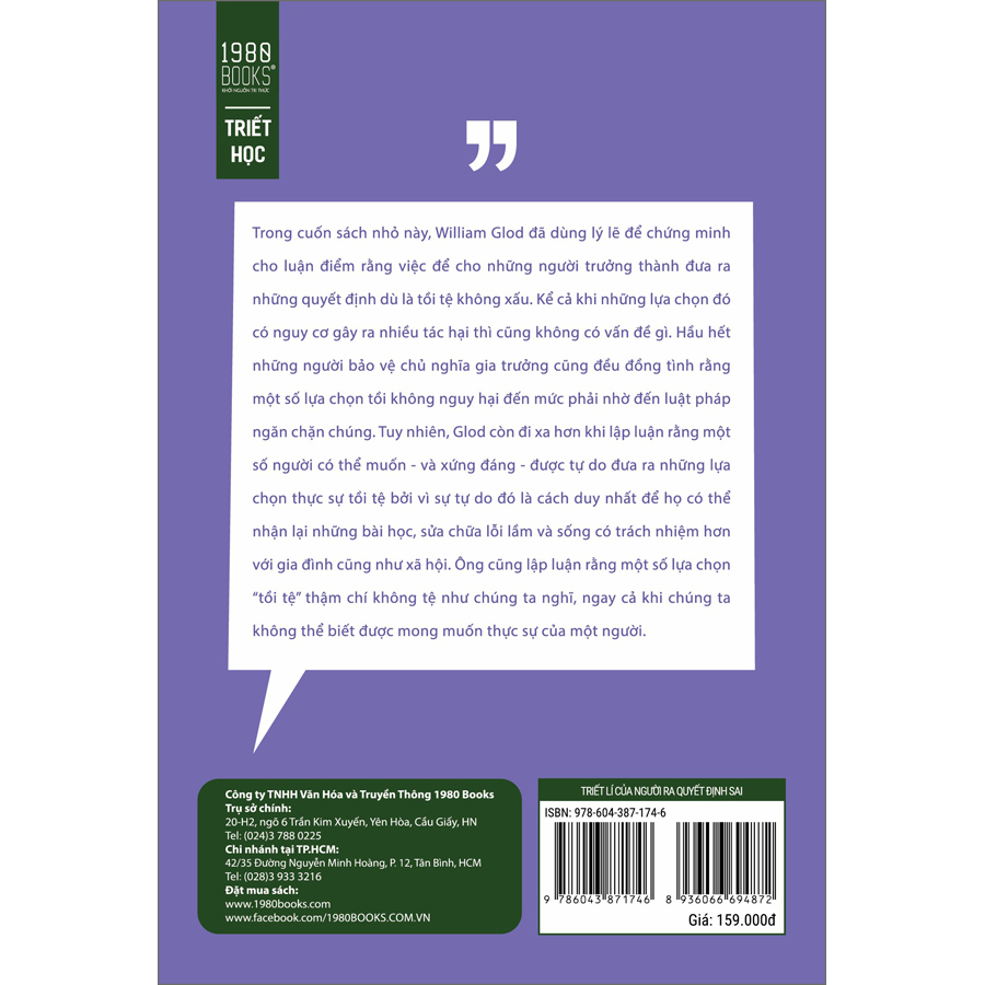 Triết Lí Của Người Ra Quyết Định Sai Nếu chúng ta là người tử tế, chúng ta sẽ quan tâm đến người khác, kể cả những người có xu hướng tự làm tổn thương mình. Tất cả chúng ta đều từng có bạn bè hoặc người thân có tiềm năng phát triển nhưng phung phí hoặc thậm chí là hủy hoại cuộc sống của họ vì những thứ như lạm dụng chất kích thích, quyết định chi tiêu thiếu khôn ngoan hoặc thói quen ăn kiêng không lành mạnh. Sự quan tâm mà chúng ta dành cho người khác thường thúc đẩy chúng ta tán thành luật pháp hoặc các biện pháp can thiệp riêng tư nhằm giữ cho mọi người không làm hại bản thân ngay cả khi đó là điều họ muốn làm. Tuy nhiên, những biện pháp can thiệp mang tính “gia trưởng” như vậy không hề tốt và chúng có xu hướng khiến chúng ta quên đi rằng chúng ta nên để những người trưởng thành tự quyết định. Trong cuốn sách nhỏ này, William Glod đã dùng lý lẽ để chứng minh cho luận điểm rằng việc để cho những người trưởng thành đưa ra những quyết định dù là tồi tệ không xấu. Kể cả khi những lựa chọn đó có nguy cơ gây ra nhiều tác hại thì cũng không có vấn đề gì. Hầu hết những người bảo vệ chủ nghĩa gia trưởng cũng đều đồng tình rằng một số lựa chọn tồi không nguy hại đến mức phải nhờ đến luật pháp ngăn chặn chúng. Tuy nhiên, Glod còn đi xa hơn khi lập luận rằng một số người có thể muốn - và xứng đáng - được tự do đưa ra những lựa chọn thực sự tồi tệ bởi vì sự tự do đó là cách duy nhất để họ có thể hành động có trách nhiệm. Ông cũng lập luận rằng một số lựa chọn “tồi tệ” thậm chí không tệ như chúng ta nghĩ, ngay cả khi chúng ta không thể biết được mong muốn thực sự của một người. THÔNG TIN TÁC GIẢ William Glod là Cán bộ Phụ trách kế hoạch cấp cao của Viện Nghiên cứu Nhân đạo, một tổ chức giáo dục phi lợi nhuận liên kết với Đại học George Mason tại Arlington, bang Virginia. Tiến sĩ Glod quan tâm đến việc nghiên cứu đạo đức học nhân đức và triết học chính trị, đặc biệt là chủ nghĩa tự do cổ điển.