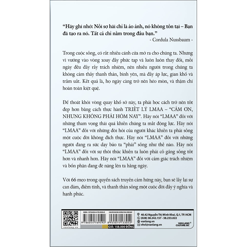- Cordula Nussbaum - Trong cuộc sống, có rất nhiều cánh cửa mở ra cho chúng ta. Nhưng vì vướng vào vòng xoay đầy phức tạp và luôn luôn thay đổi, mỗi ngày đều đầy rẫy trách nhiệm, nên nhiều người trong chúng ta không cảm thấy thanh thản, bình yên, mà đầy áp lực, gian khổ và trầm uất. Kết quả là, họ ngày càng trở nên héo mòn, và thậm chí hoàn toàn kiệt quệ. Để thoát khỏi vòng quay khổ sở này, ta phải học cách trở nên tốt đẹp hơn bằng cách thực hành Triết lý LMAA – “Cảm ơn, nhưng không phải hôm nay”. Hãy nói “LMAA” đối với những tham vọng thái quá khiến chúng ta mất động lực. Hãy nói “LMAA” đối với những đòi hỏi của người khác khiến ta phải sống một cuộc đời không đích thực. Hãy nói “LMAA” đối với những người đang ra sức dạy bảo ta “phải” sống như thế nào. Hãy nói “LMAA” đối với sự thôi thúc khiến ta luôn phải cố gắng sống tốt hơn và nhanh hơn. Hãy nói “LMAA” đối với cảm giác trách nhiệm và bổn phận đang đè nặng lên ta hằng ngày. Với 66 mẹo trong quyển sách truyền cảm hứng này, bạn sẽ lấy lại sự can đảm, điềm tĩnh, và thanh thản sống một cuộc đời đầy ý nghĩa và hạnh phúc.